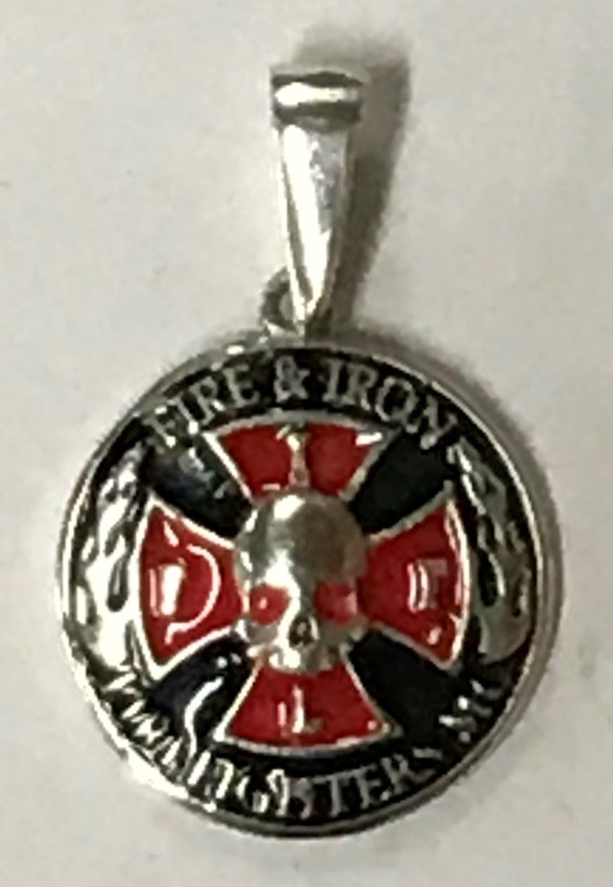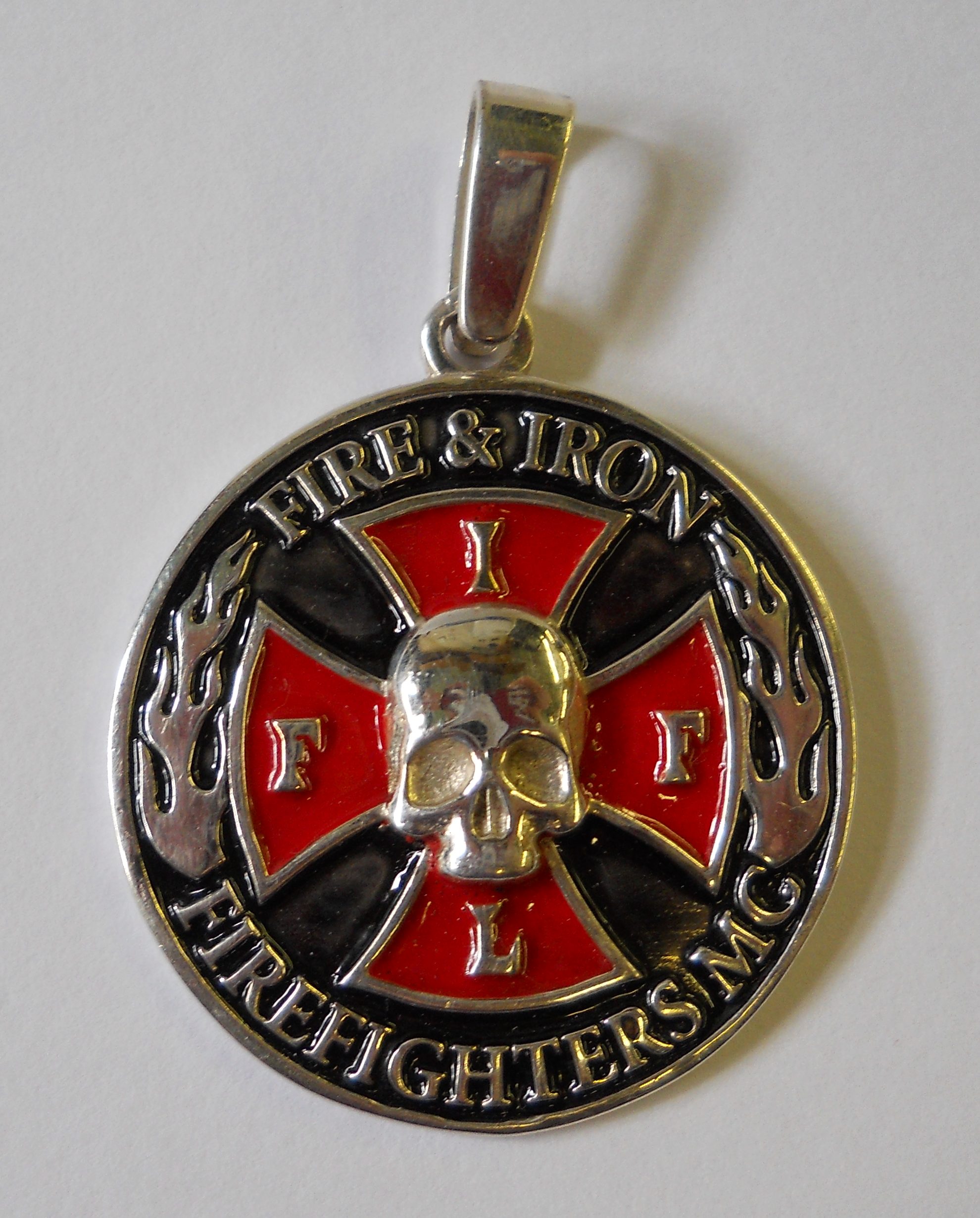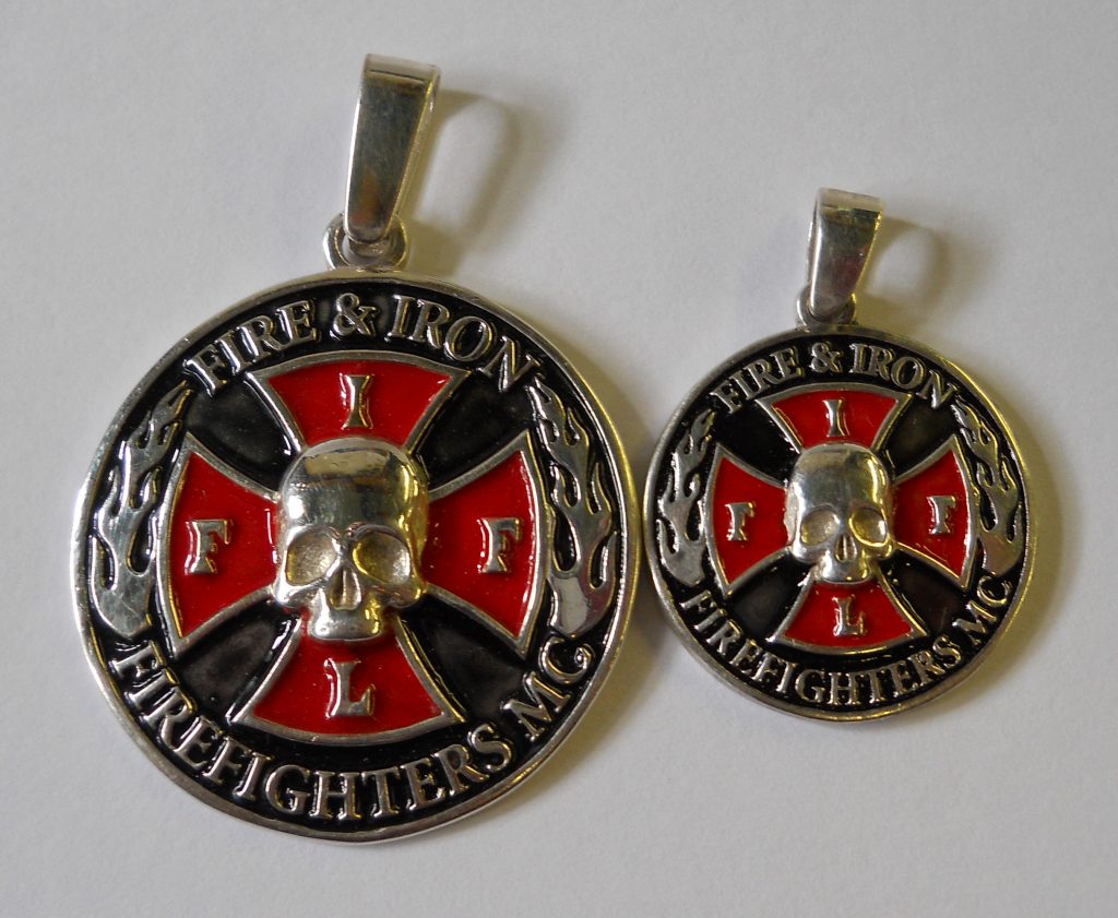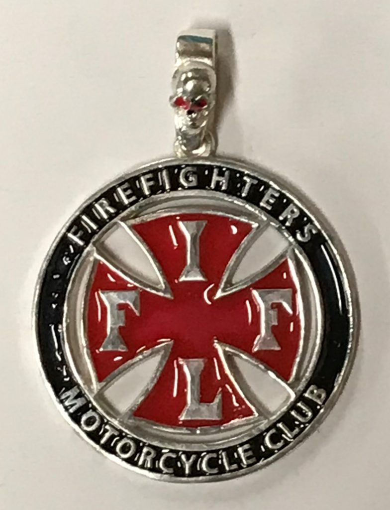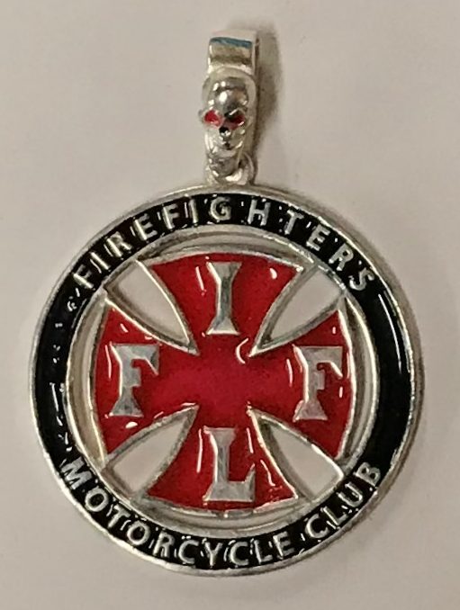 FI14 Sterling Round Enameled Pendant with “Firefighters Motorcycle Club” Surrounding the FIFL Cross that is cut out. 40mm in diameter