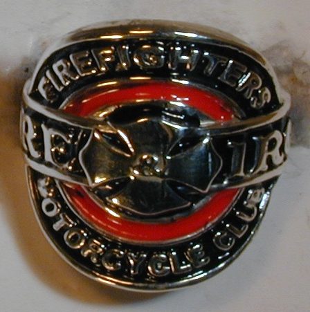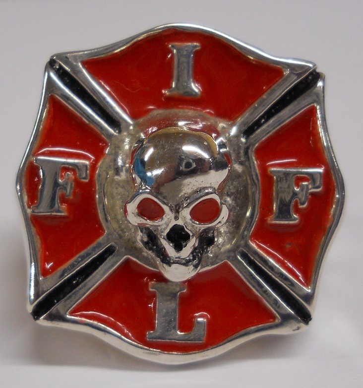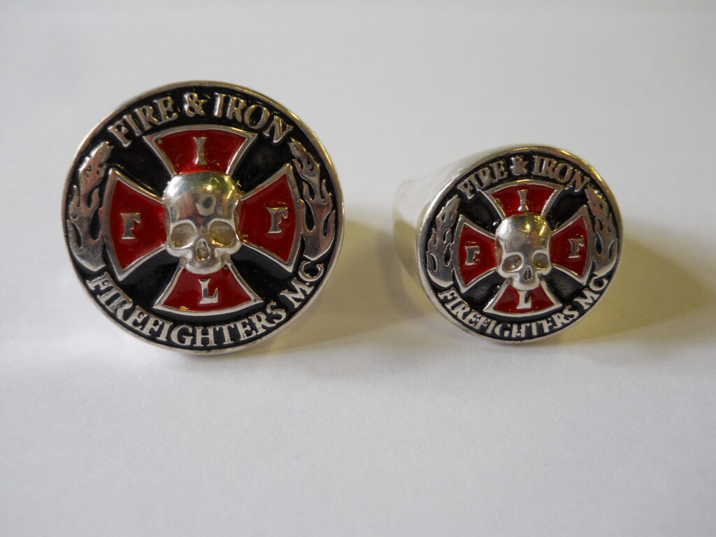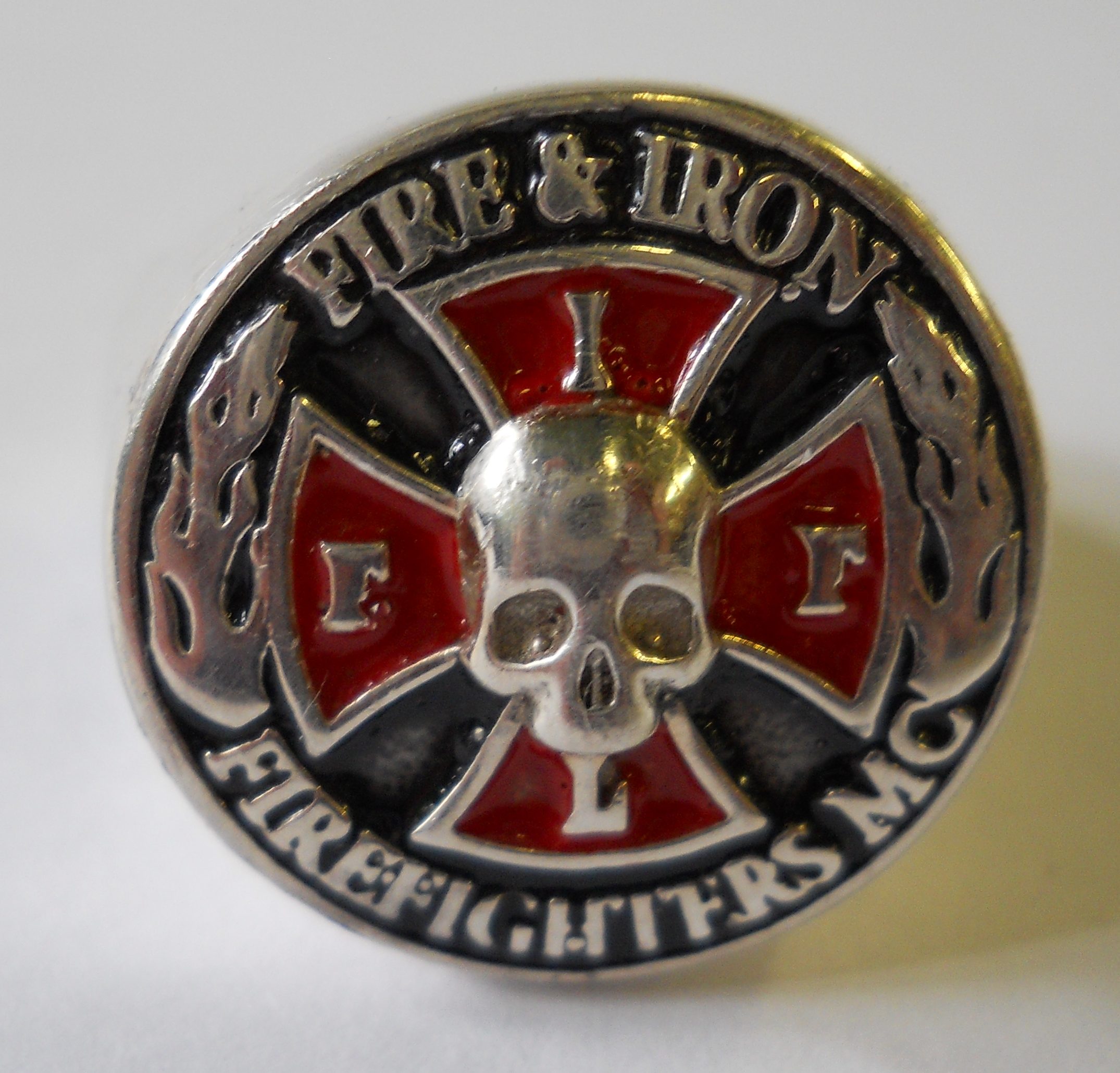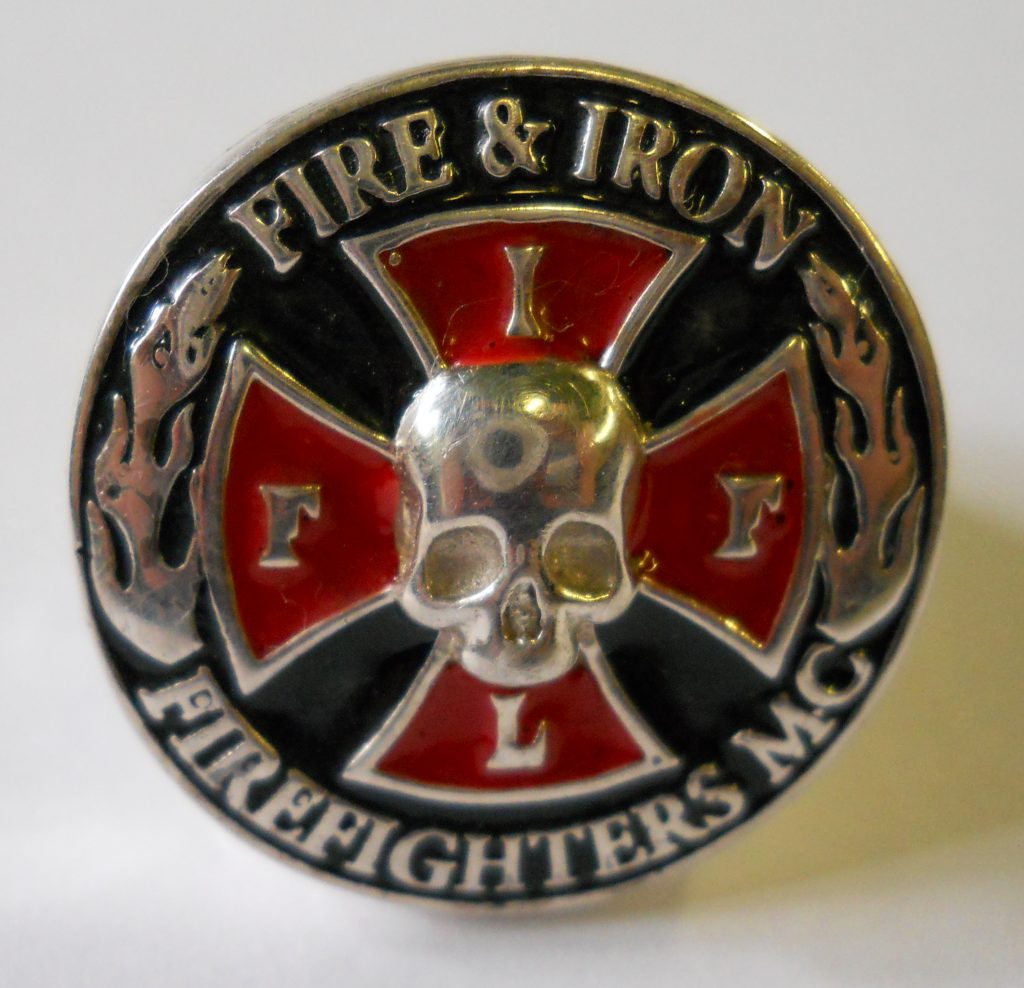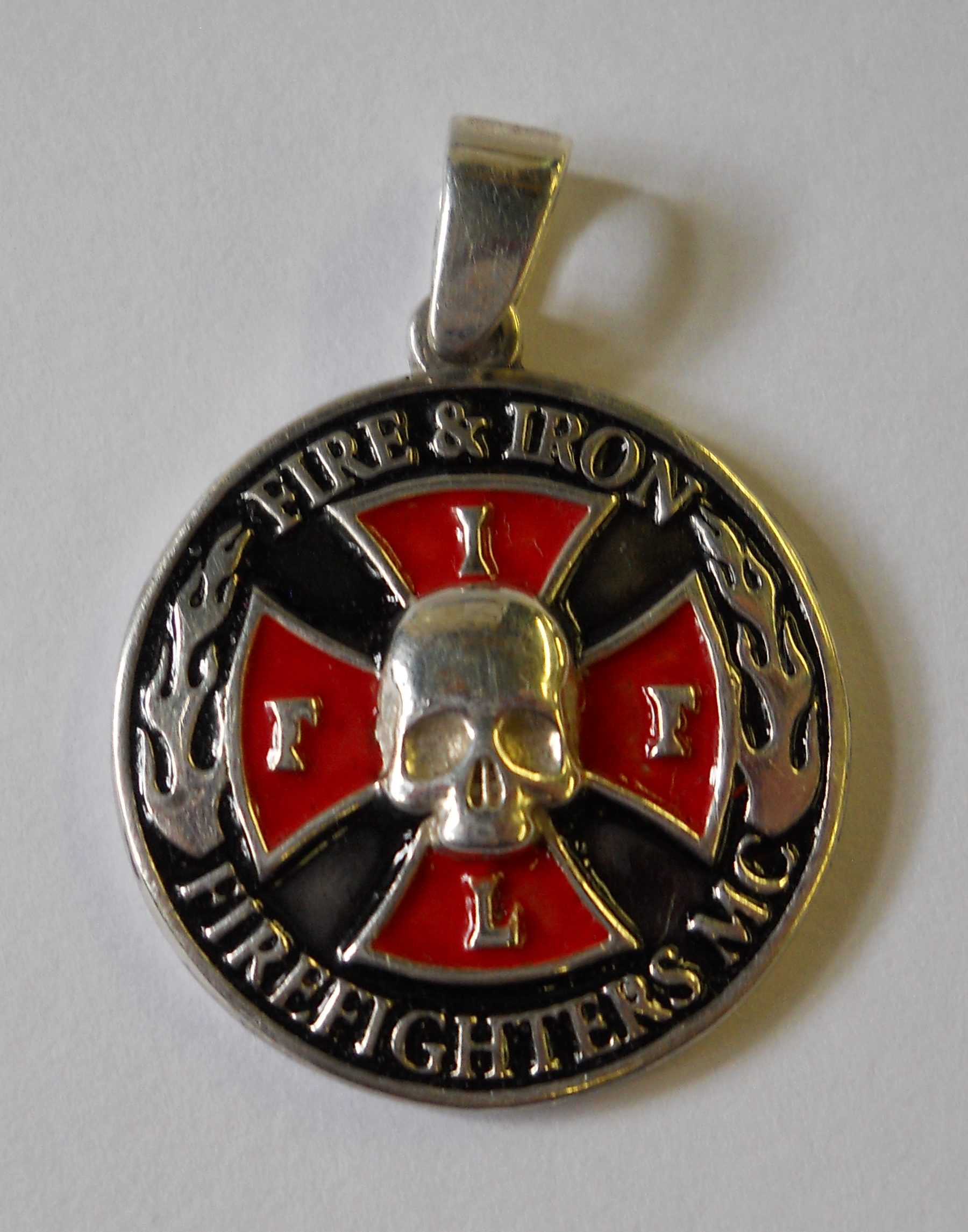 FI14 Sterling Round Enameled Pendant with “Firefighters Motorcycle Club” Surrounding the FIFL Cross that is cut out. 40mm in diameter