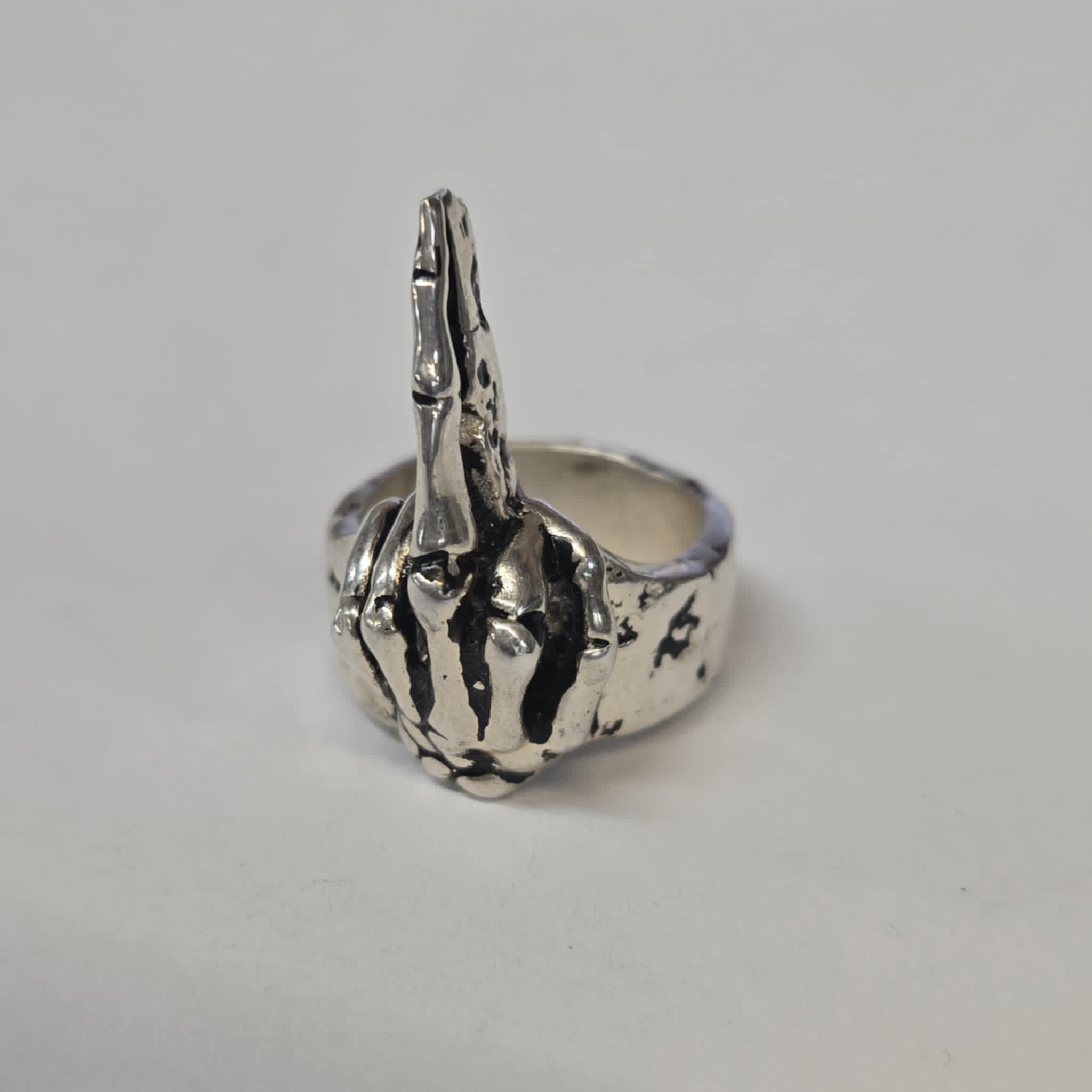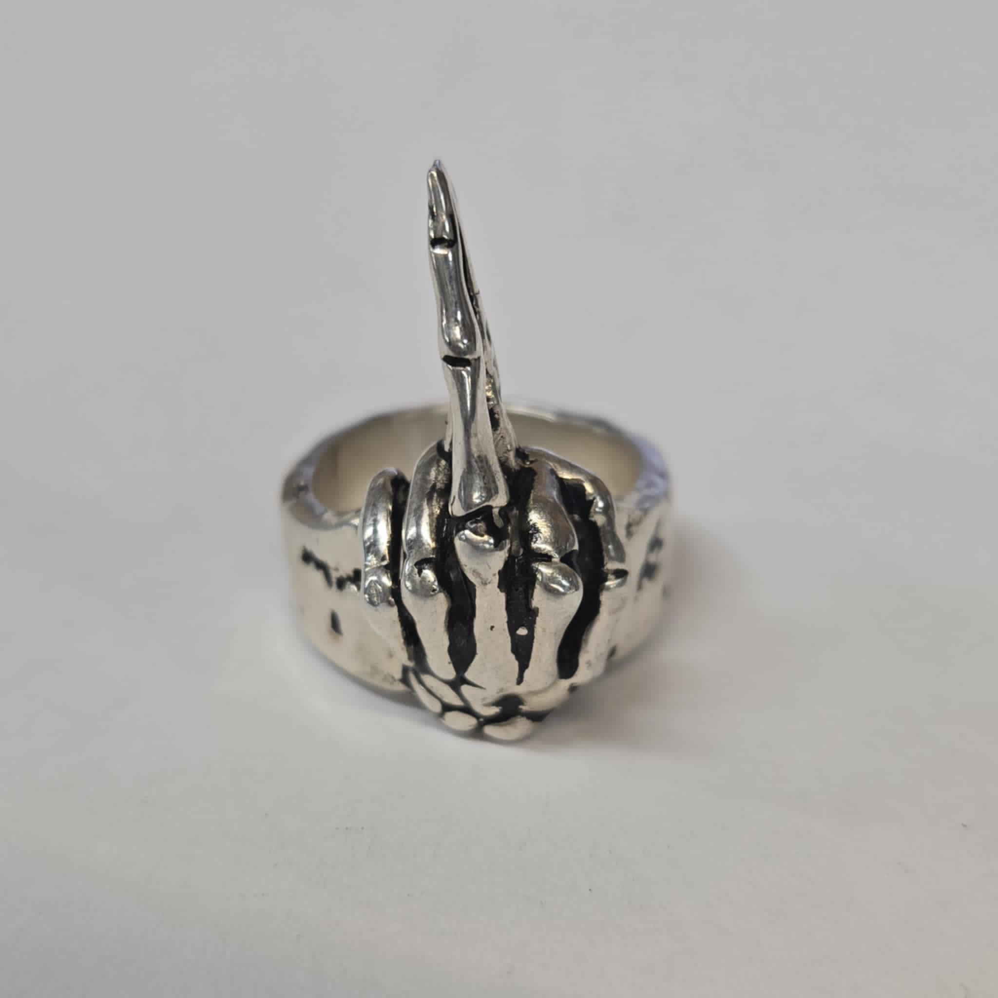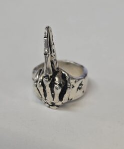 Tired of the world? Show them before they even have to ask with our sterling Bony Finger Ring. The skeletal hand has its middle finger extended loud and large!