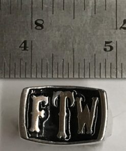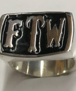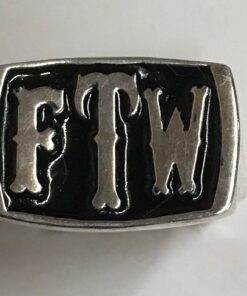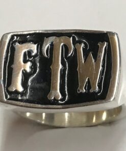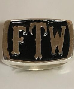 Solid, Heavy, Sterling Silver ring with the initials FTW on the top in a Western Font. The initials are open to interpretation, but usually stand for “Fuck the World”. The ring weighs about 27 grams of solid sterling silver. It also comes in 10k gold, 14k gold, 18k gold and Platinum. Please contact us for pricing.