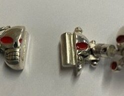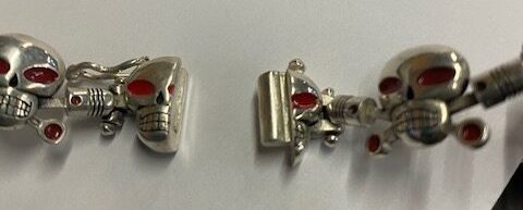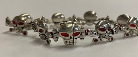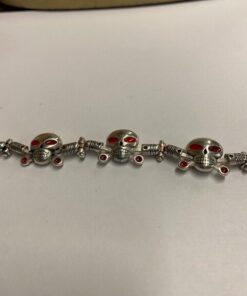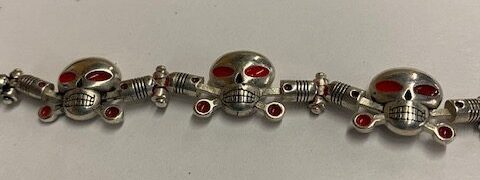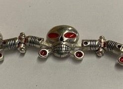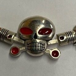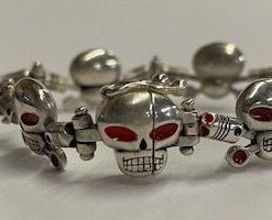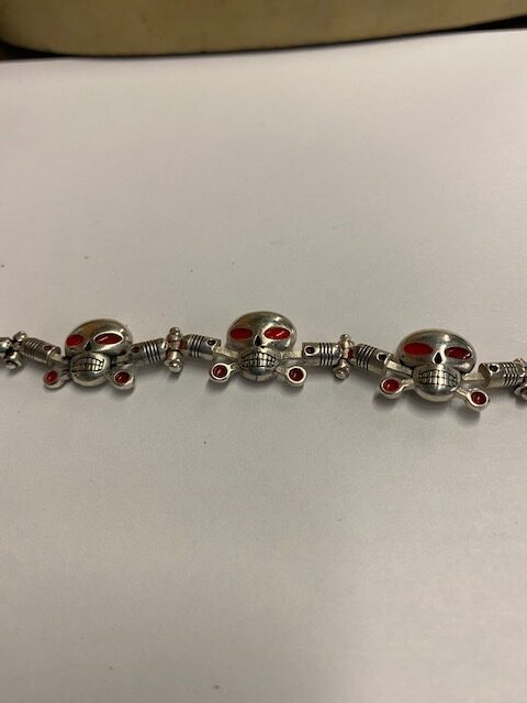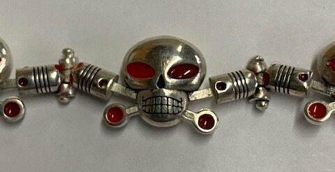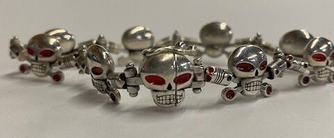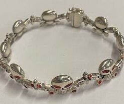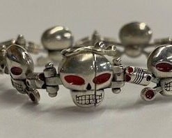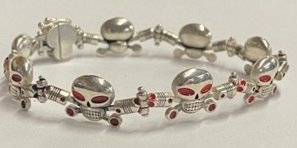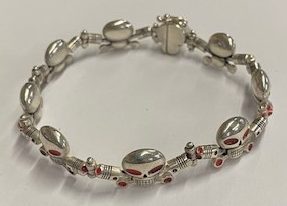 Heavy Sterling Bracelet with 7 links made of Charlie joined by rings with a heavy clasp. Charlie’s eyes and the piston ends are enameled.