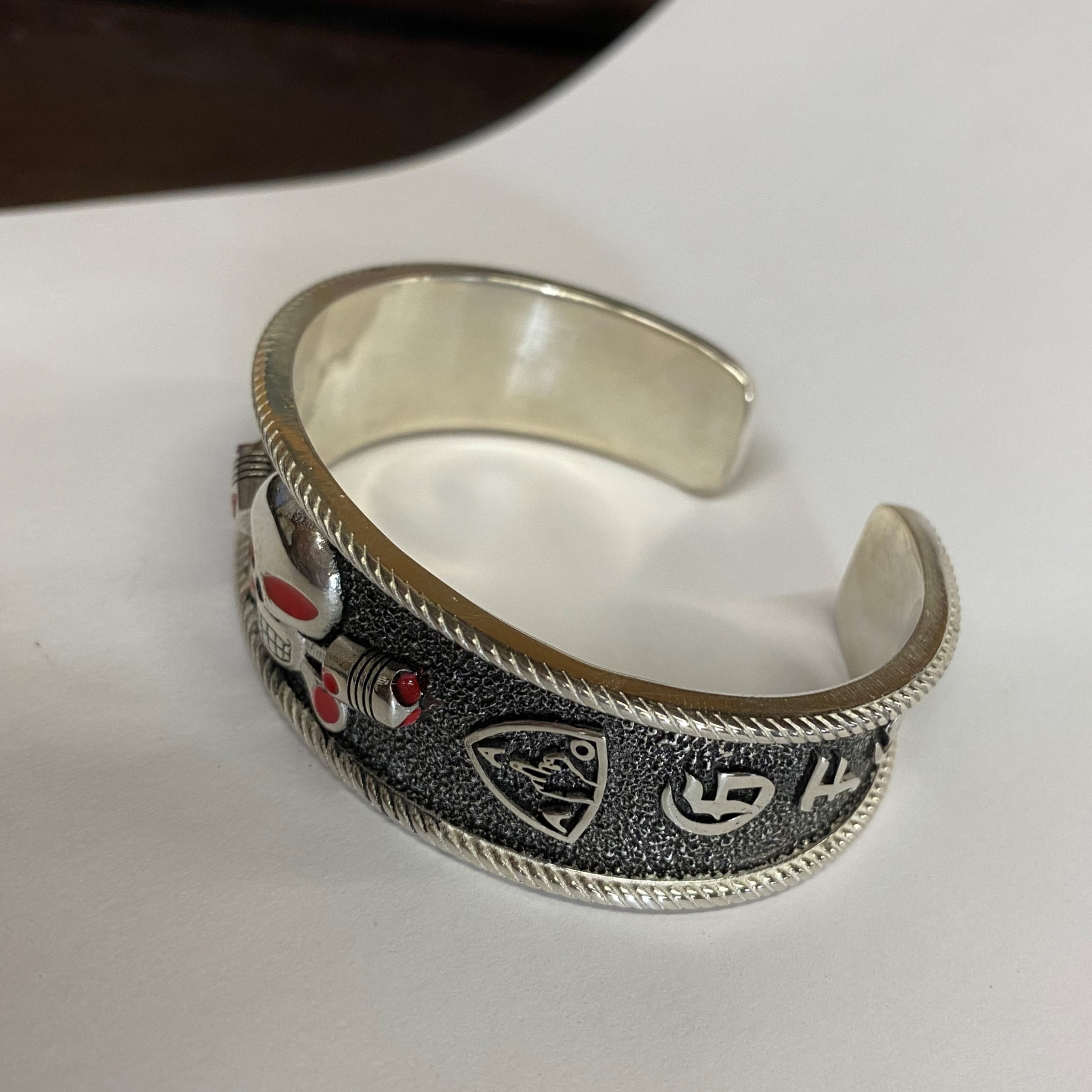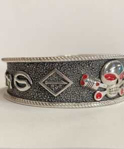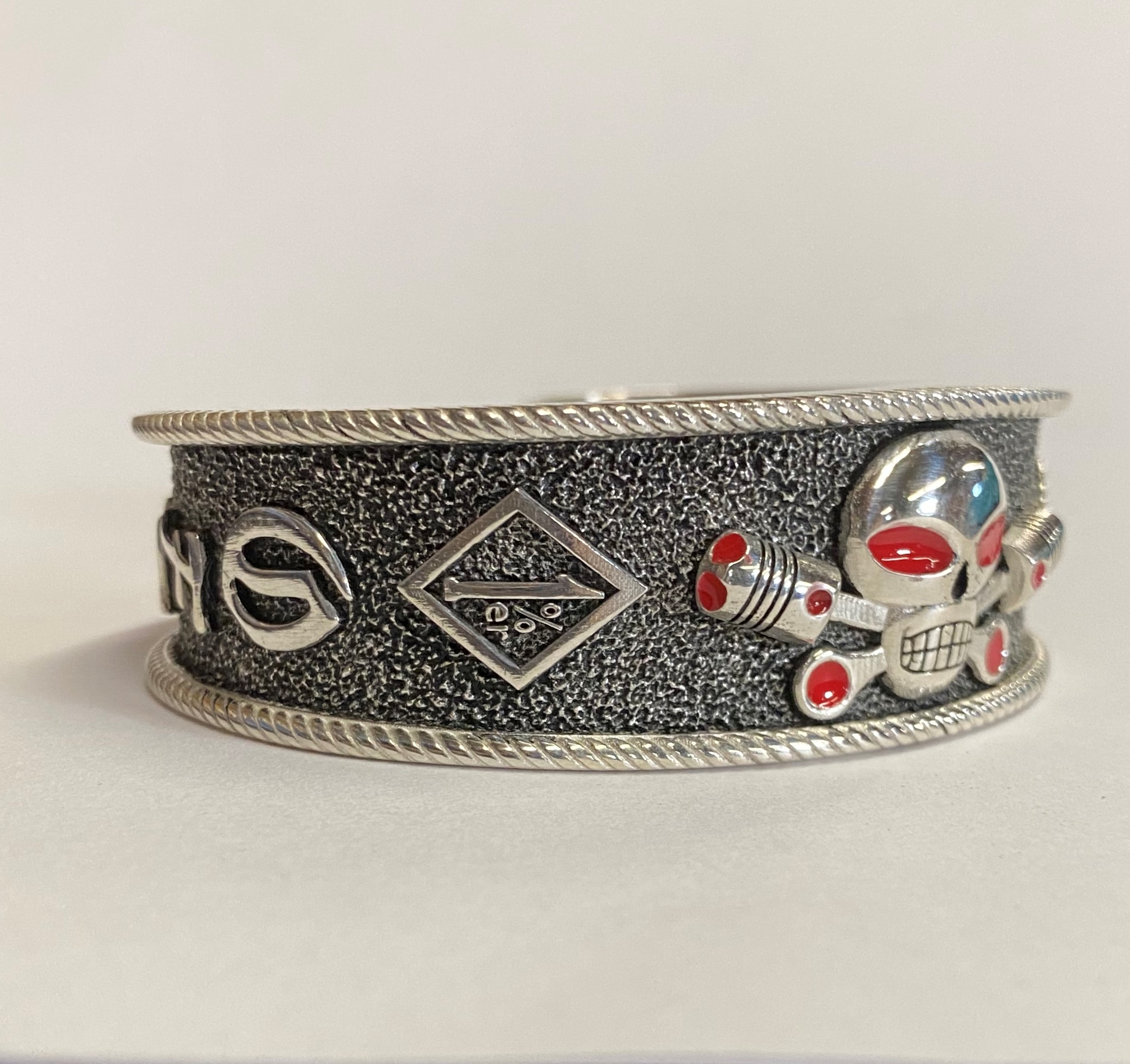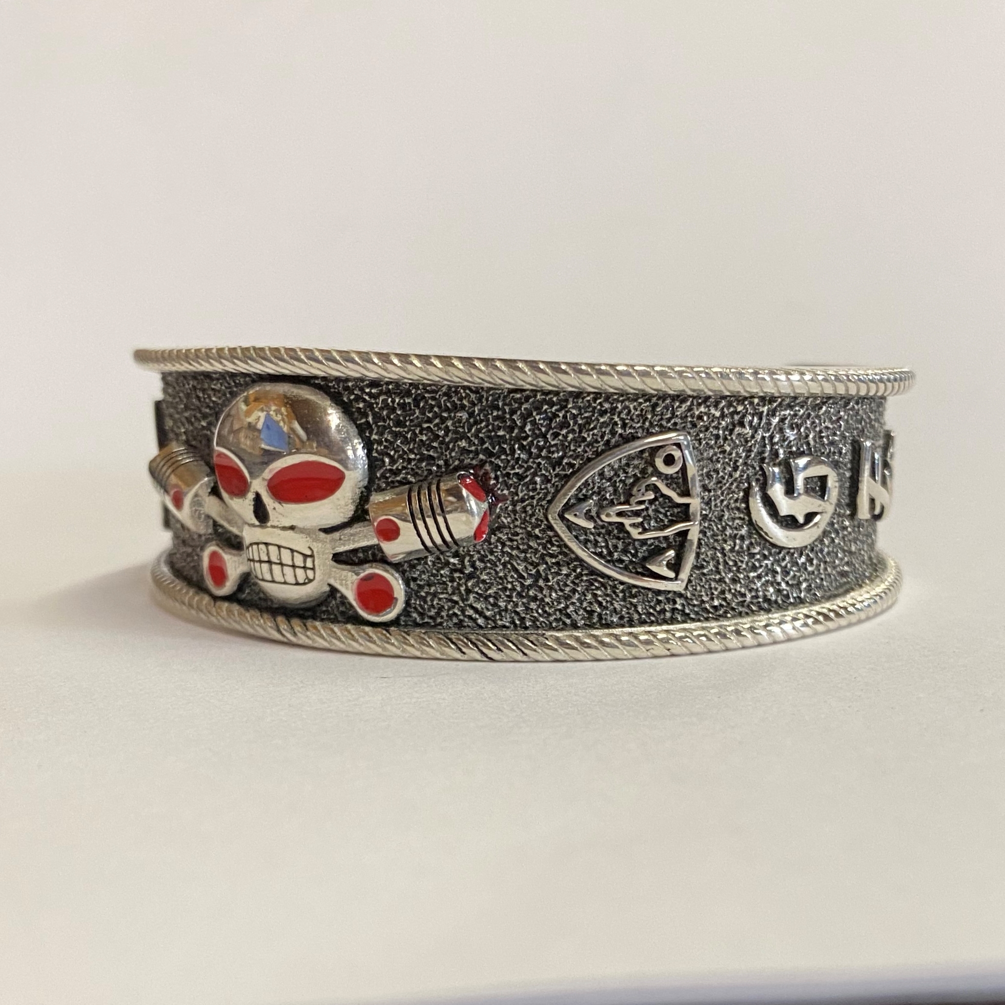 Heavy sterling Charlie cuff bracelet with GFOD on one side and OFFO on the other. Also has 1%er in a diamond shape and the AOA symbol on either side of Charlie.