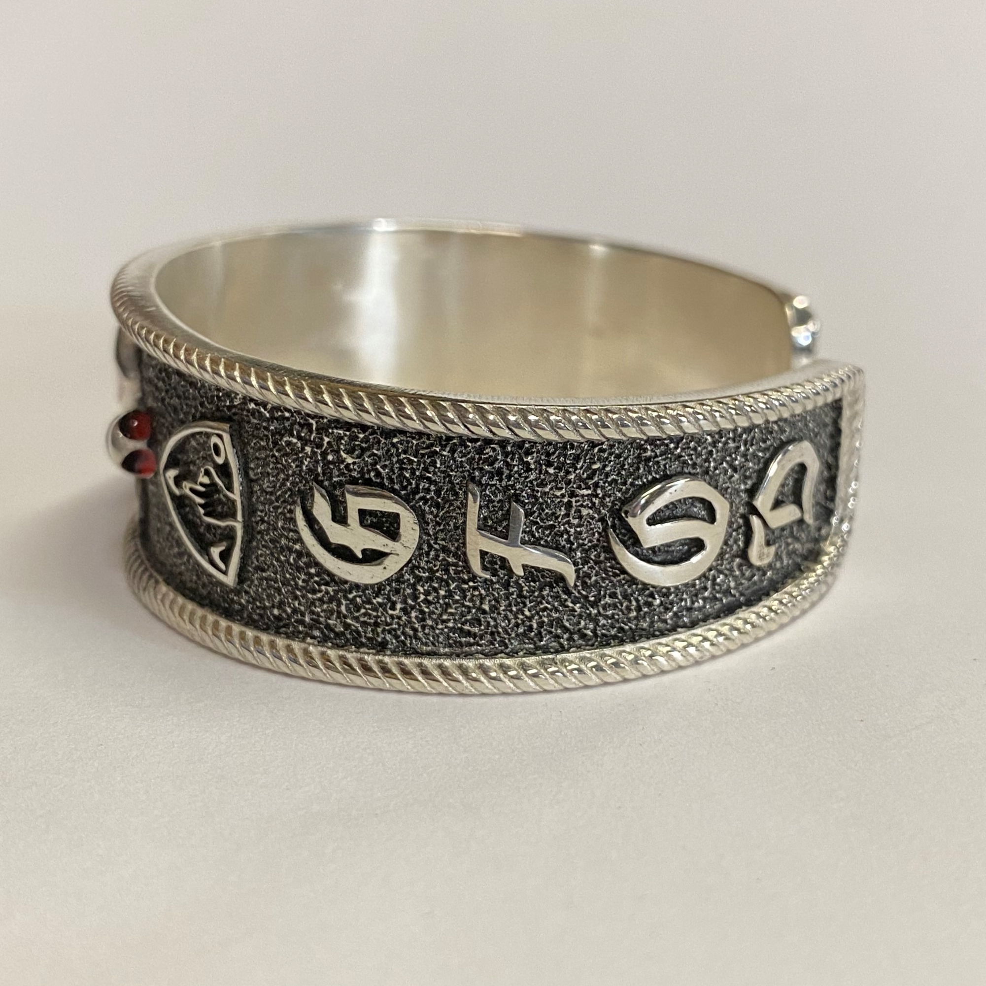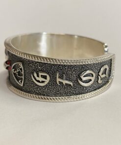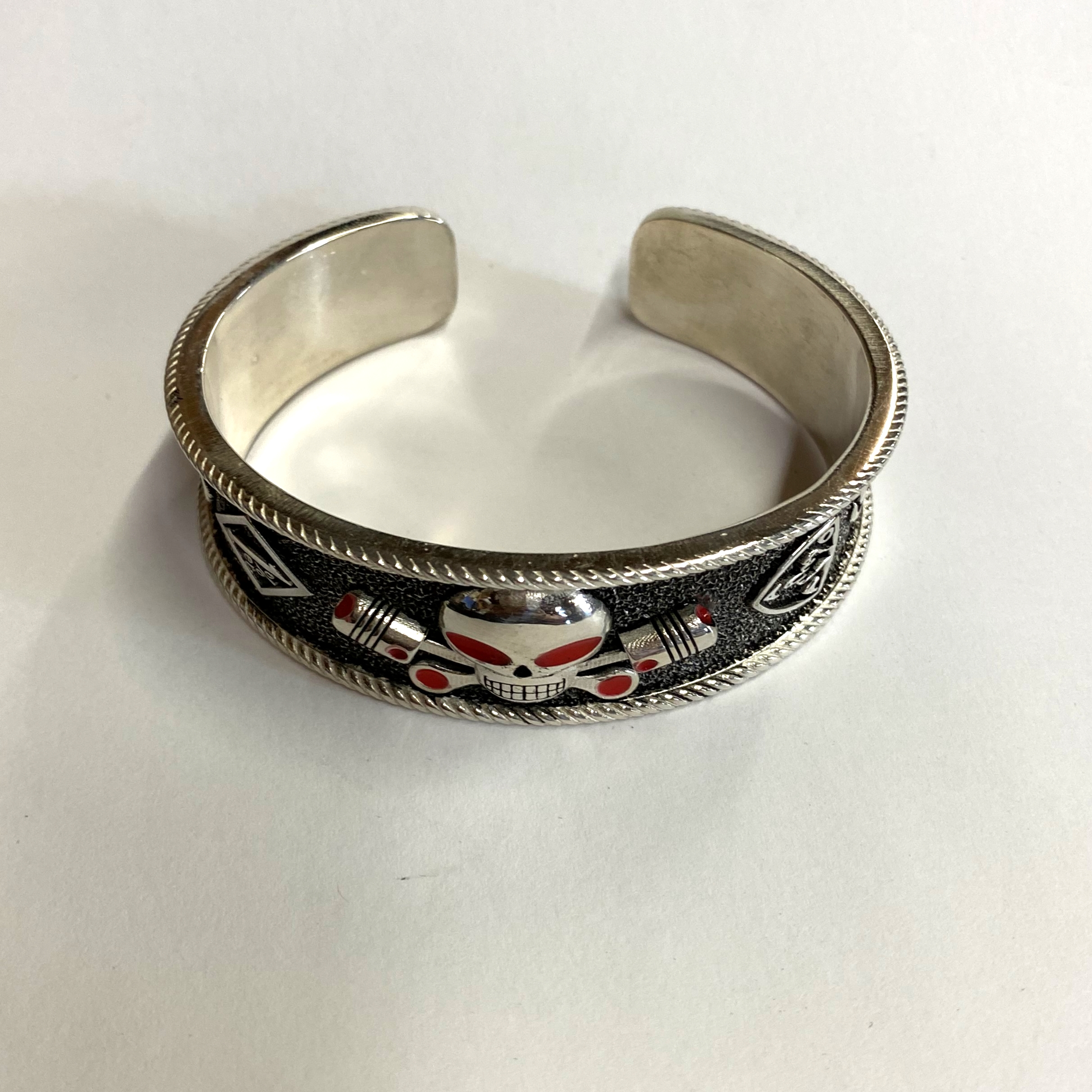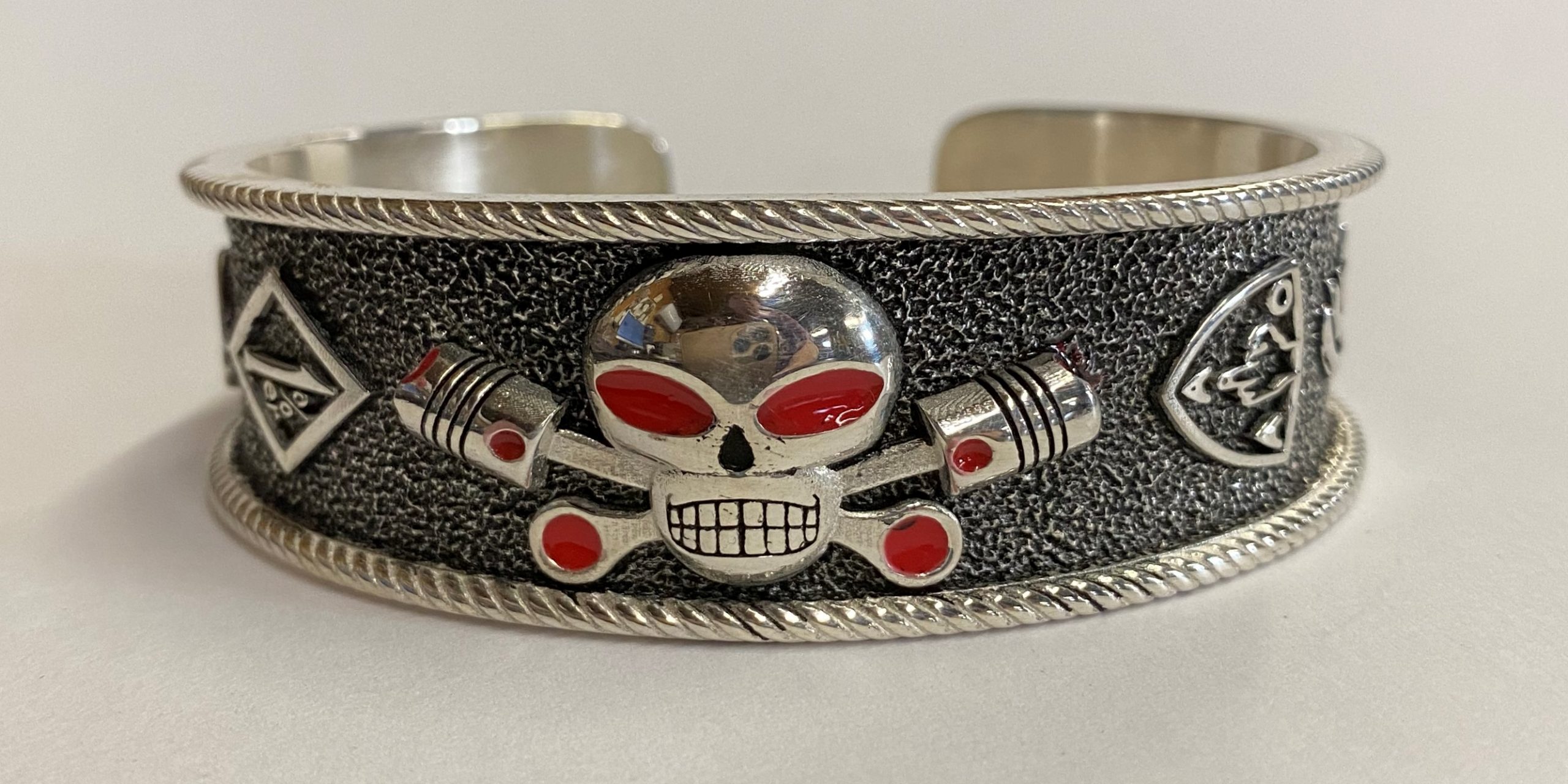 Heavy sterling Charlie cuff bracelet with GFOD on one side and OFFO on the other. Also has 1%er in a diamond shape and the AOA symbol on either side of Charlie.