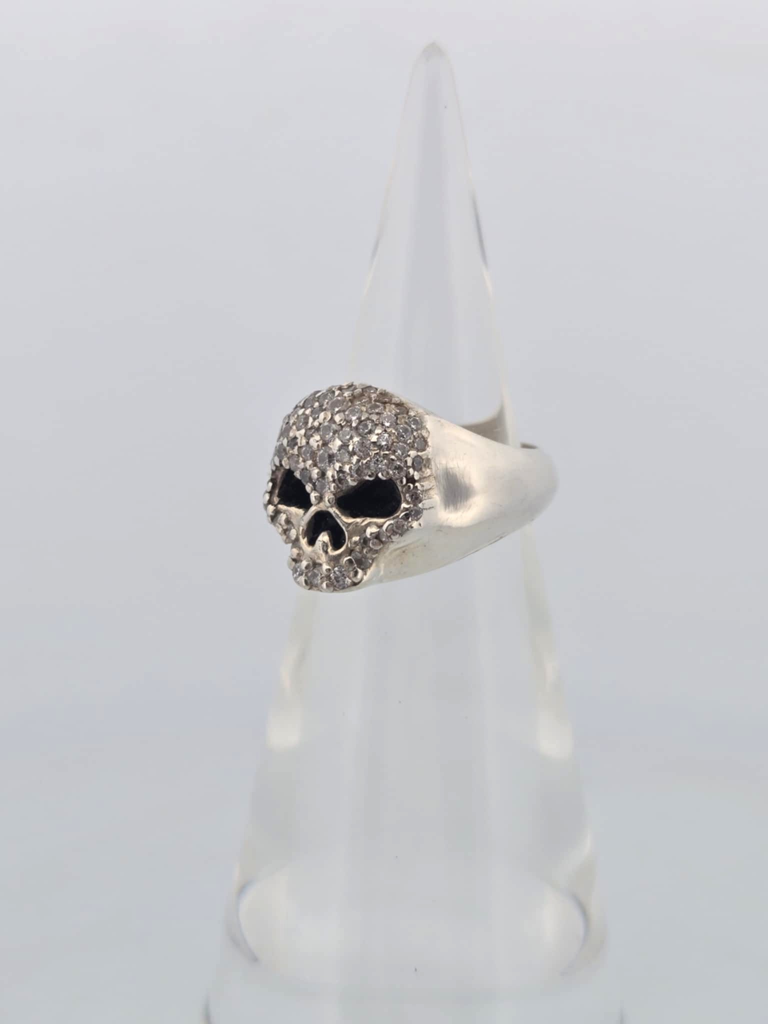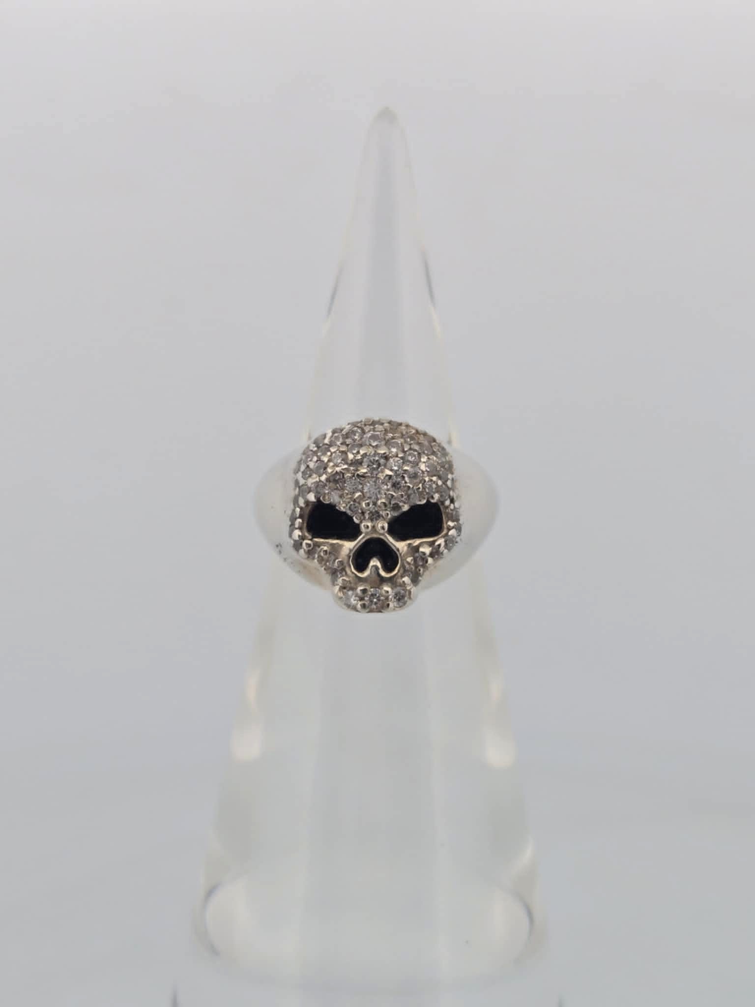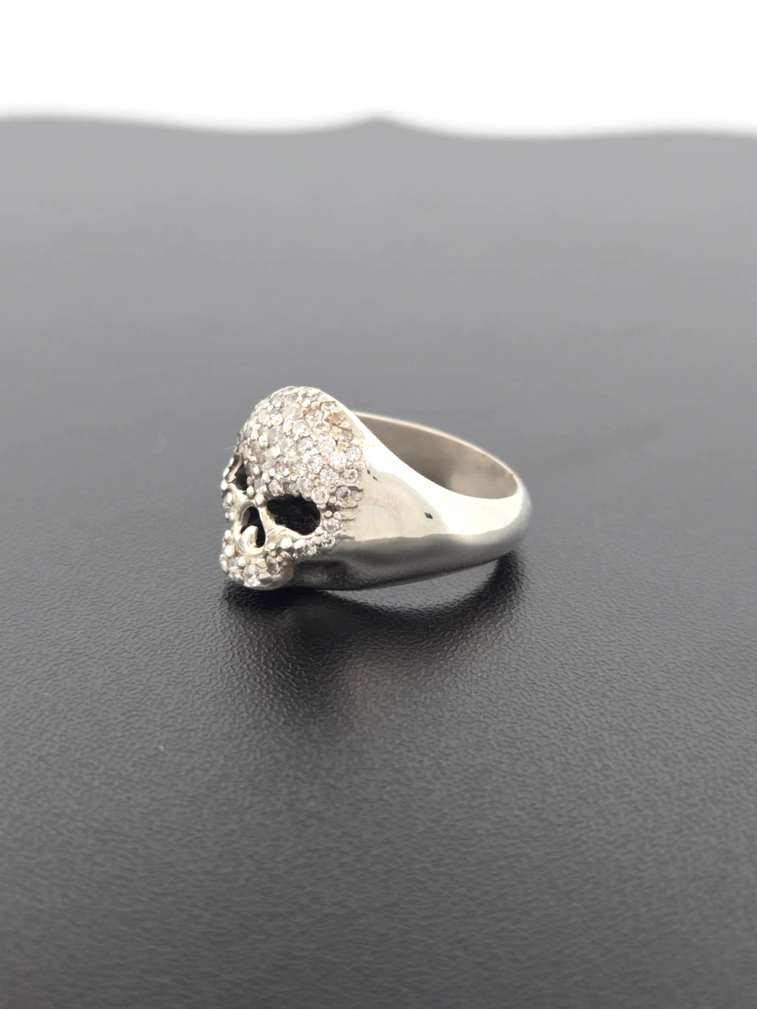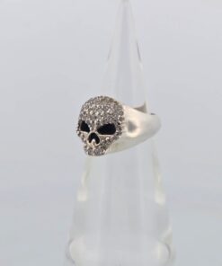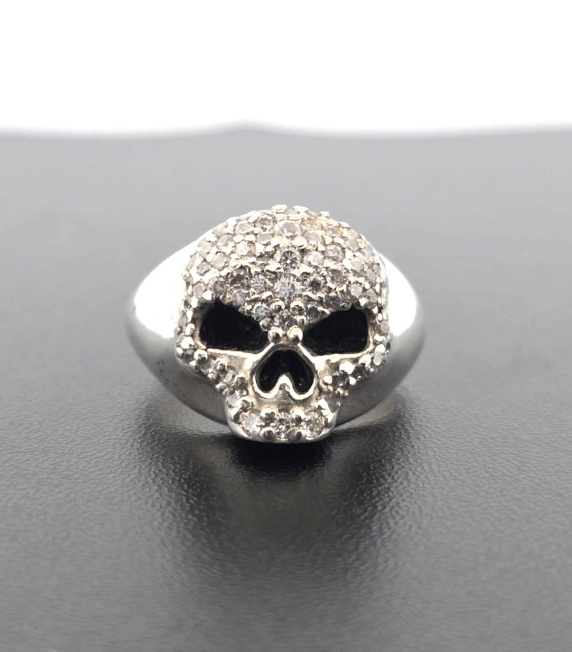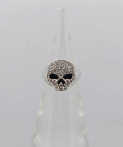 This ring features a edgy skull coved in Cubic Zirconia stones. This ring weighs 15.10 grams.