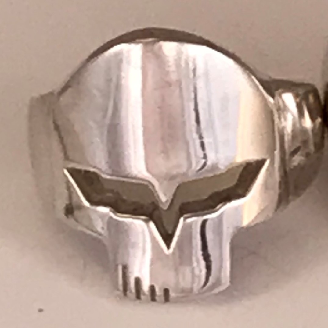 Ladies Sterling Silver Jake skull ring. Jake has the Chevey emblem for eyes. There is a larger men’s version of this ring in a separate listing on this site. This ring weighs about 11 grams of solid sterling silver. We also make this ring in 10k, 14k, and 18k gold and in Platinum. Please contact us for pricing information.
