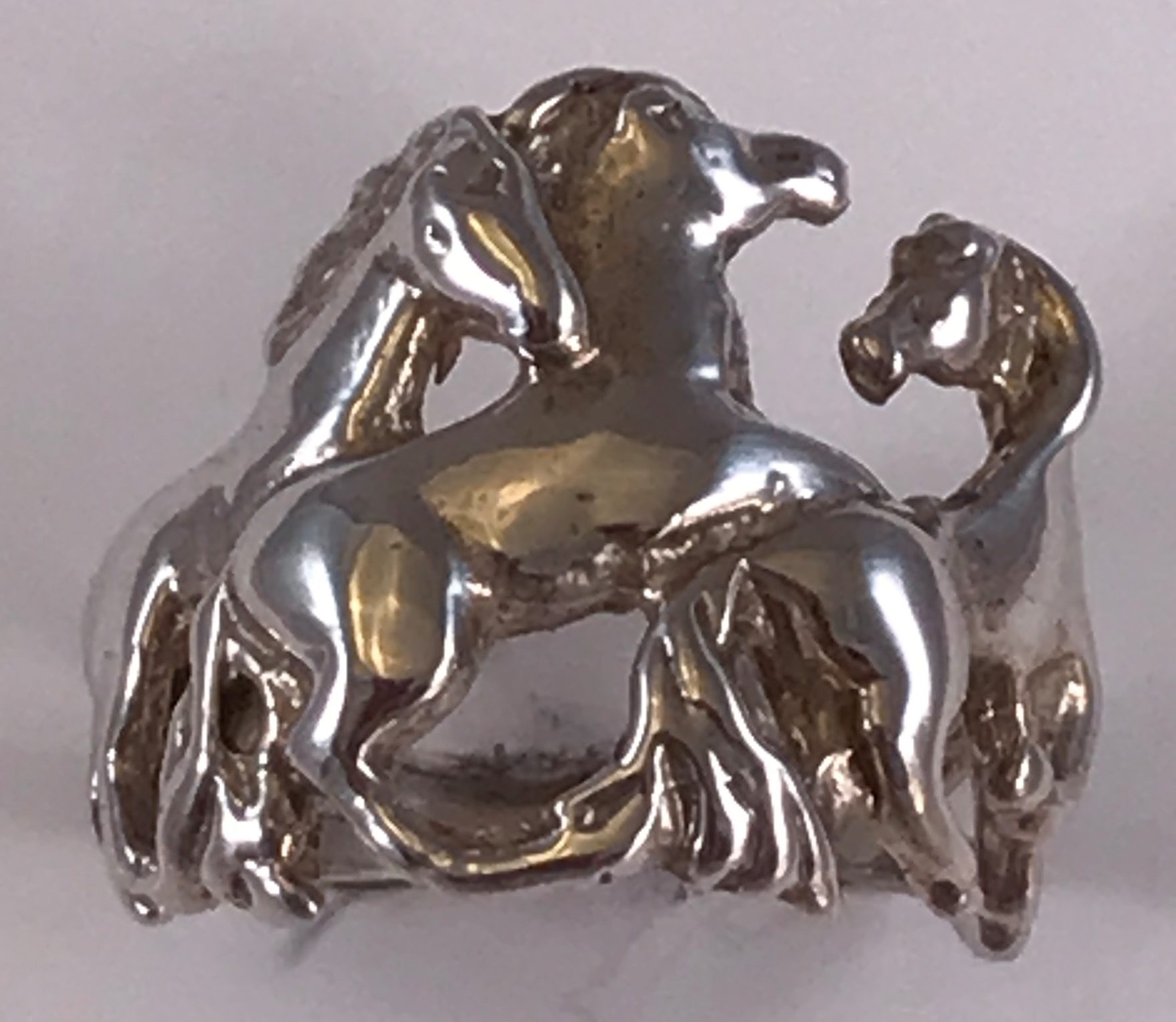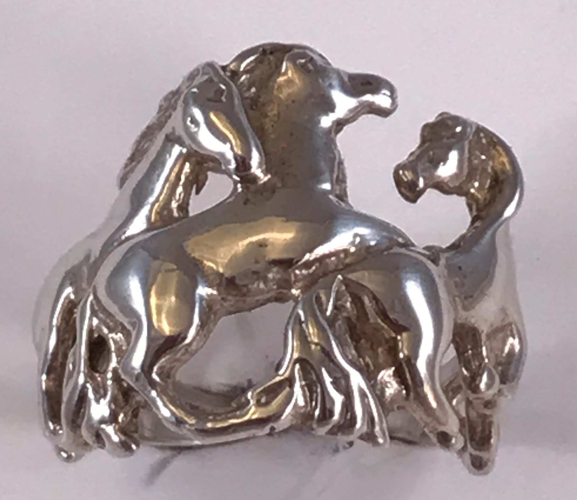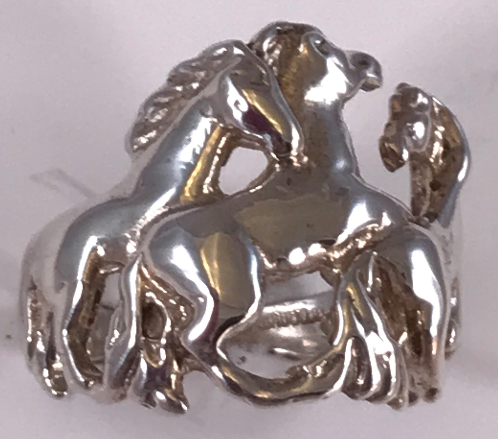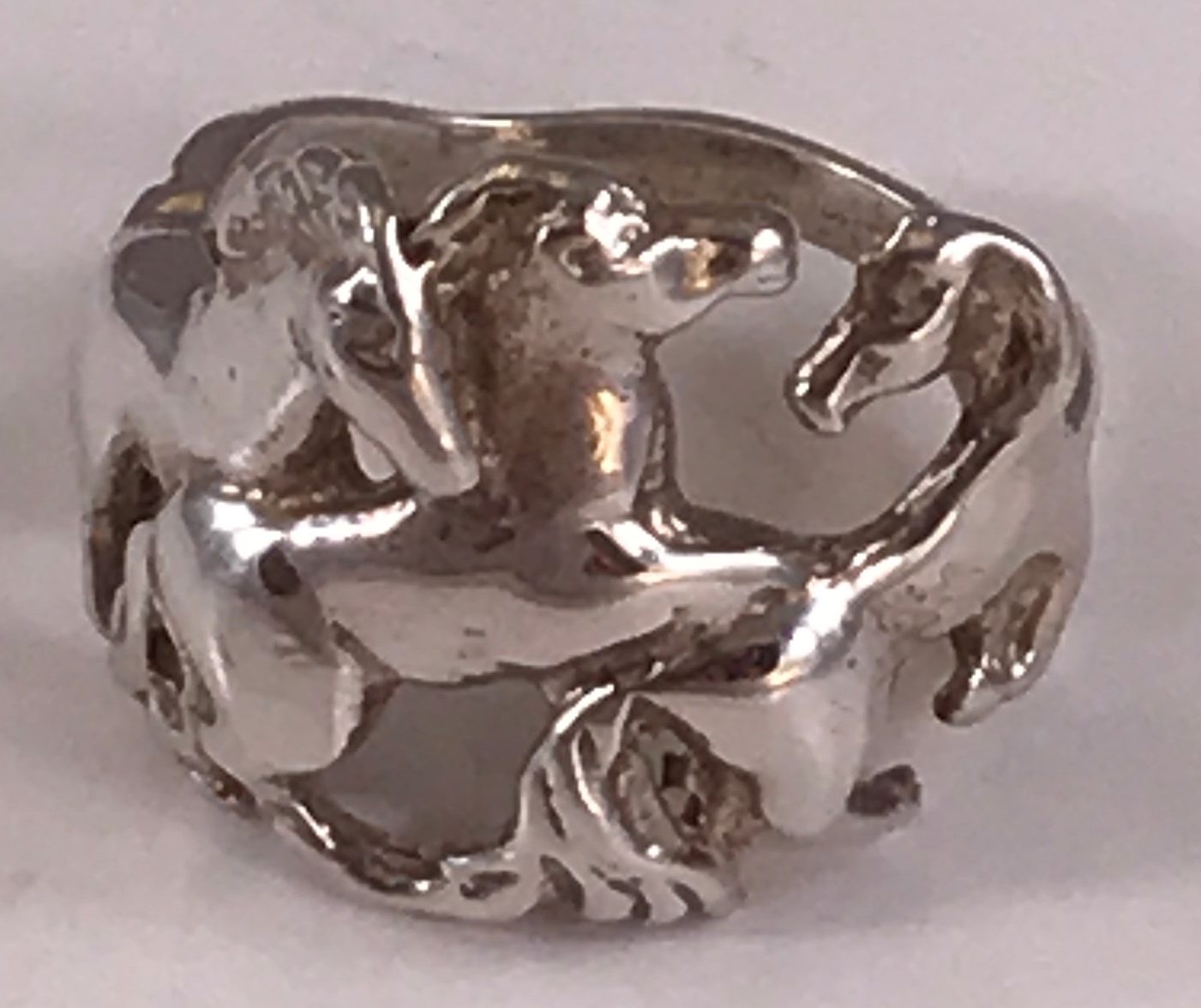 Ladies solid sterling silver ring with playful horses frolicking around the finger. Rng weighs about 7.2 grams of solid sterling silver. We also make this ring in 10k, 14k, and 18k gold and in Platinum. Please contact us for pricing information.