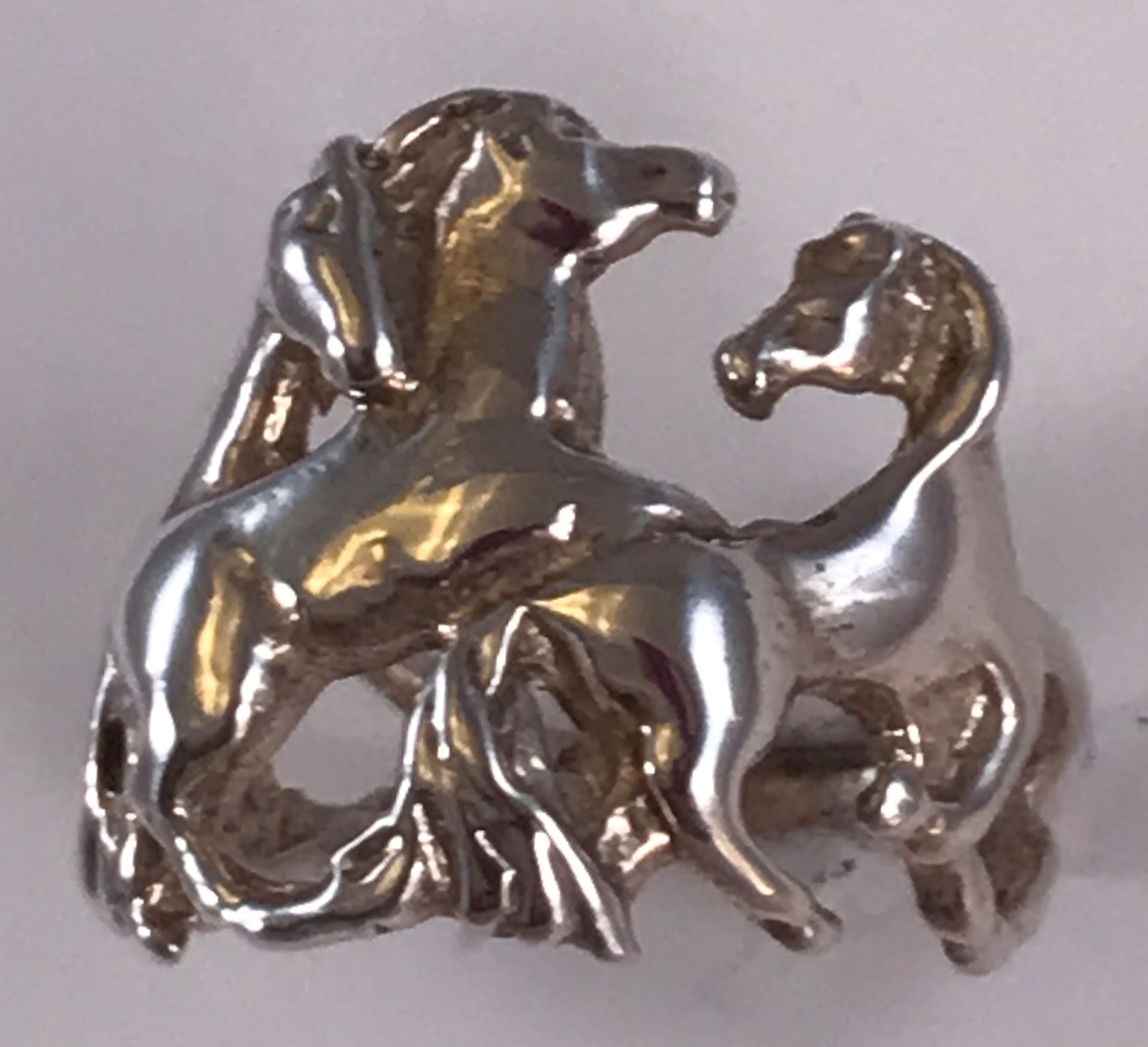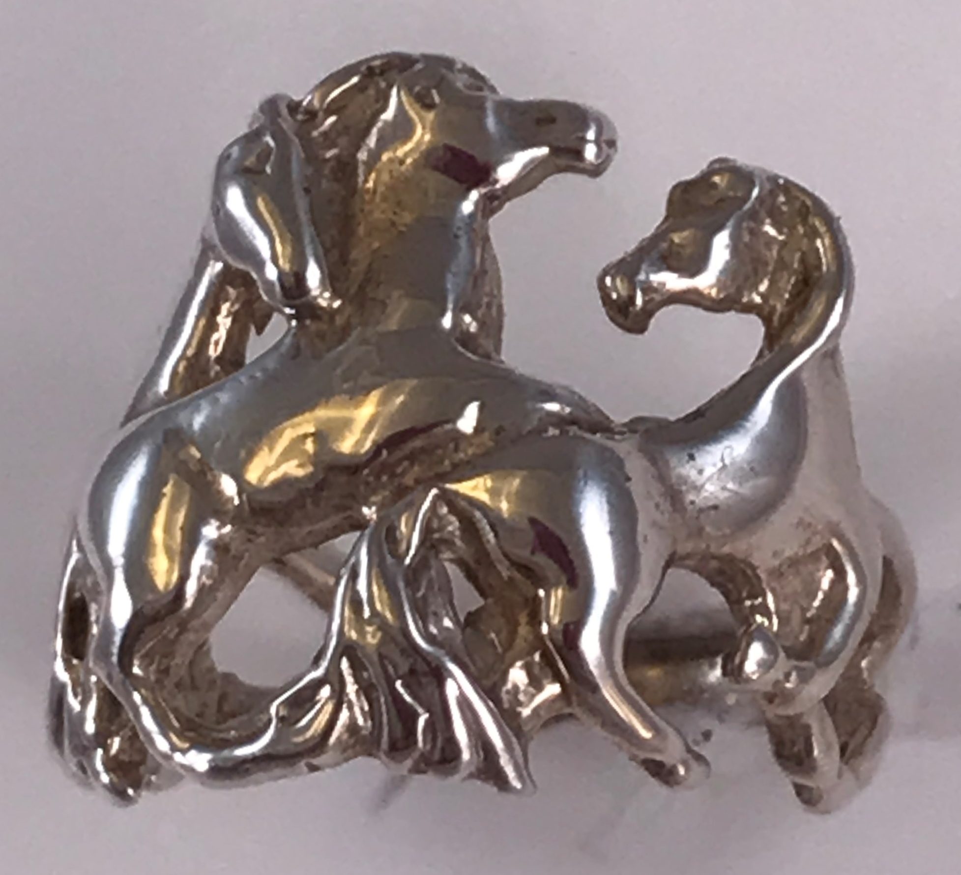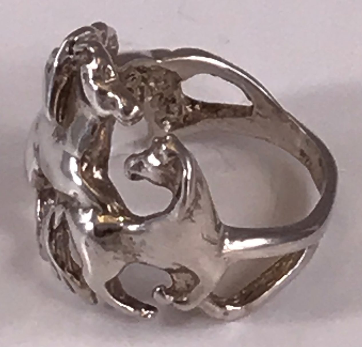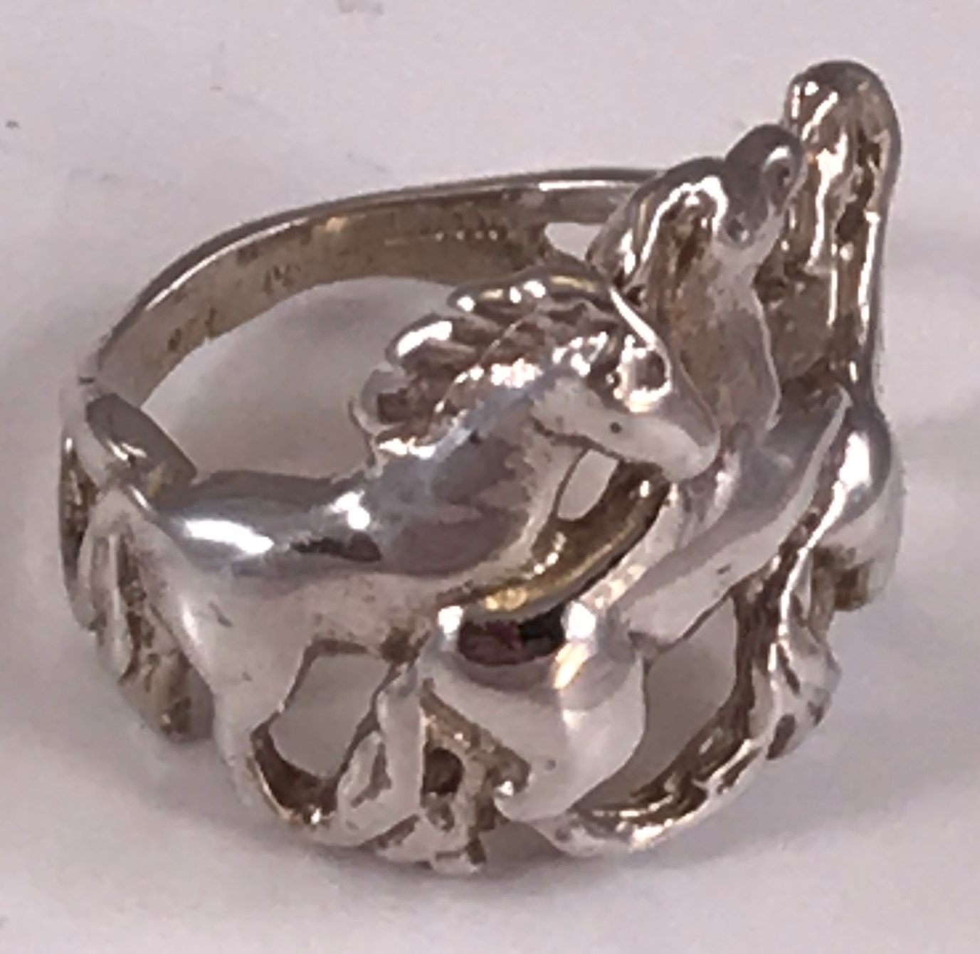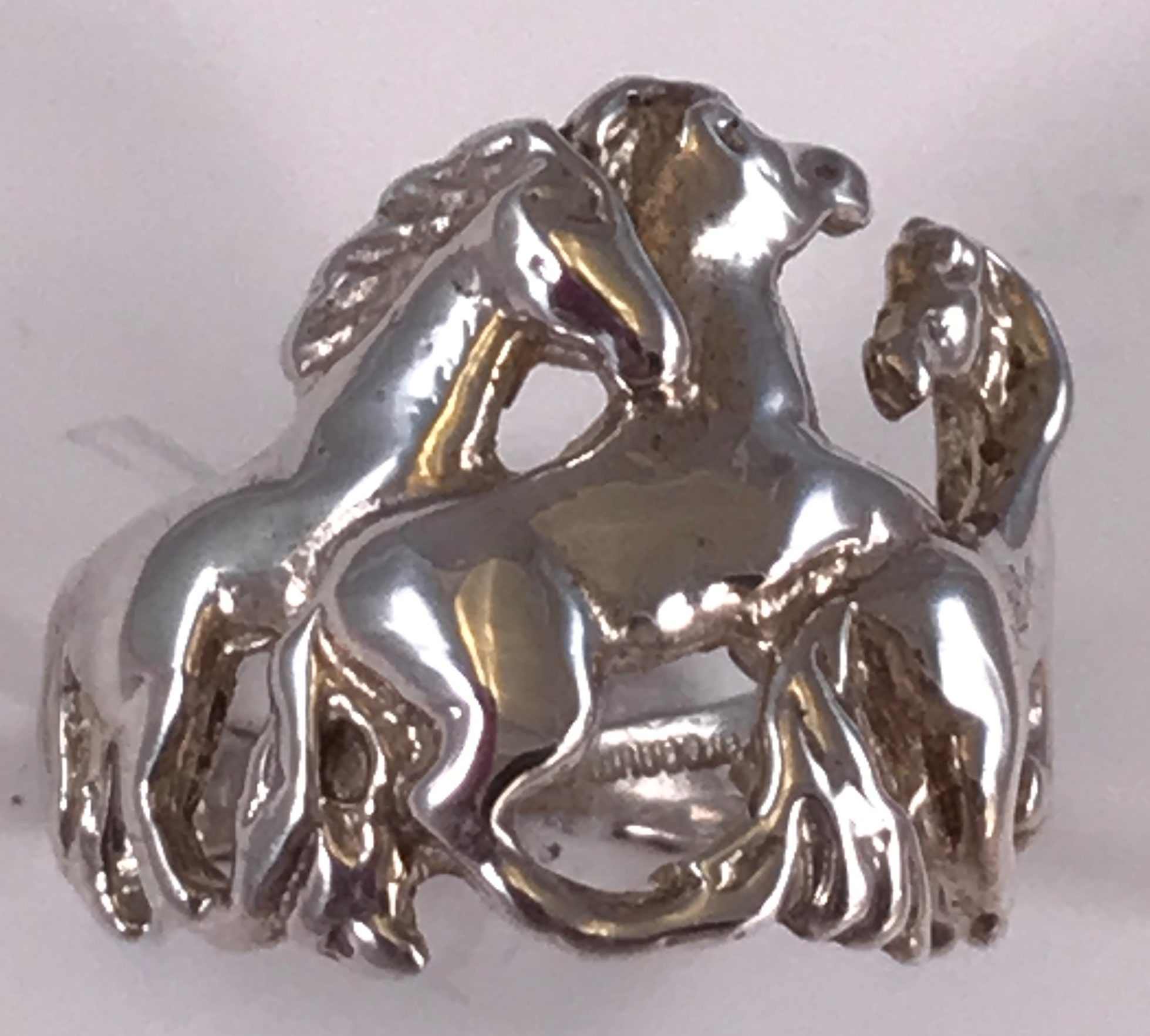 Ladies solid sterling silver ring with playful horses frolicking around the finger. Rng weighs about 7.2 grams of solid sterling silver. We also make this ring in 10k, 14k, and 18k gold and in Platinum. Please contact us for pricing information.