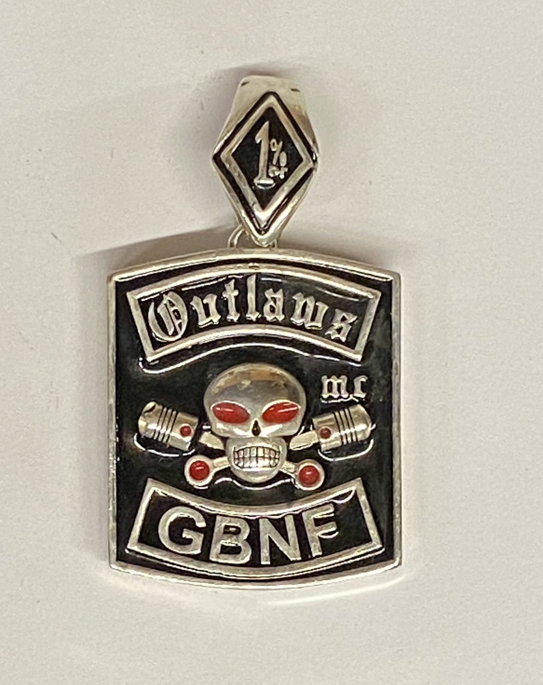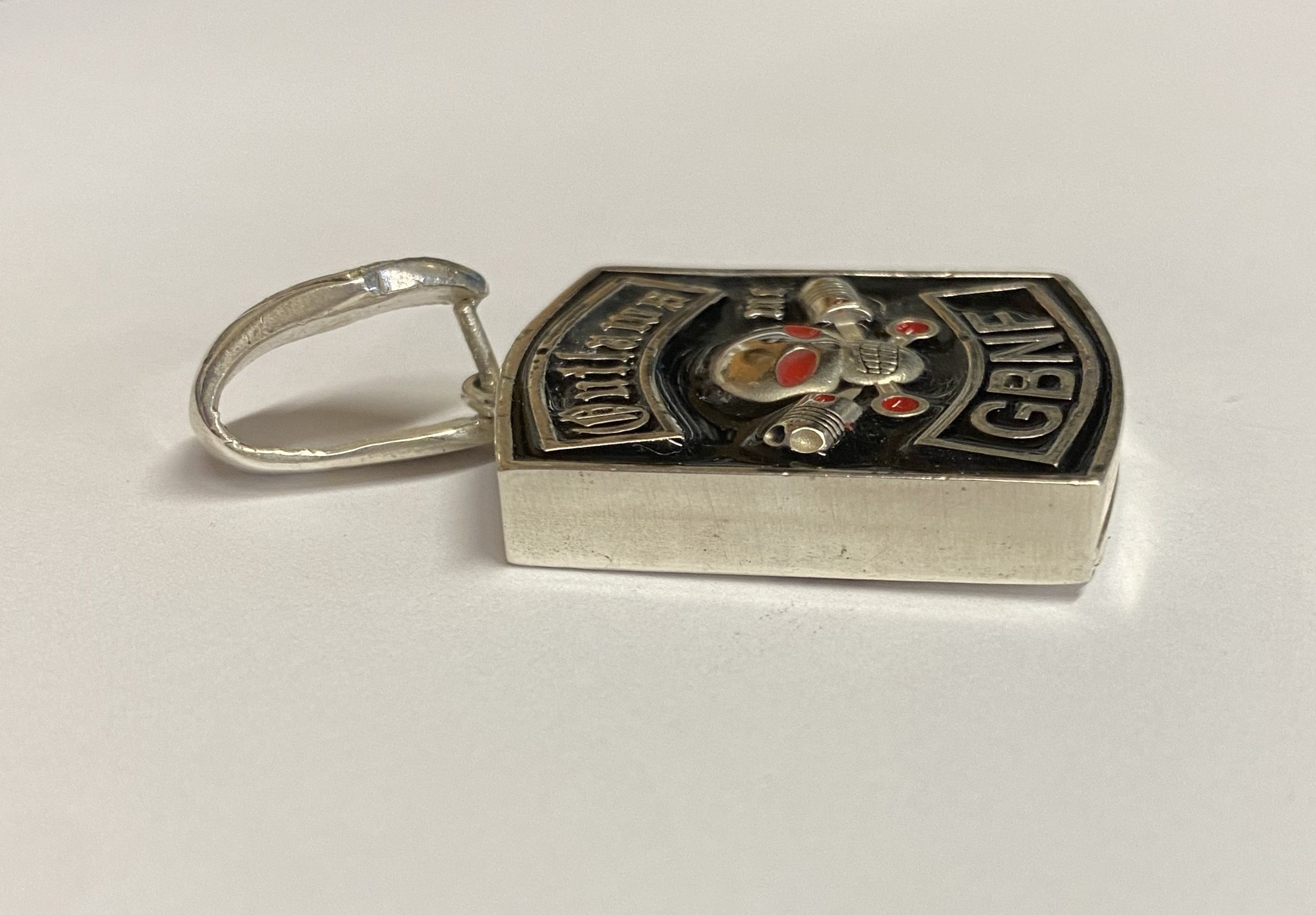 Large sterling silver pendant urn with Outlaws, Charlie and “GBNF” on the front. The back opens with a screw to hold the ashes of a departed brother. Comes with a tube of sealant to use when filled.