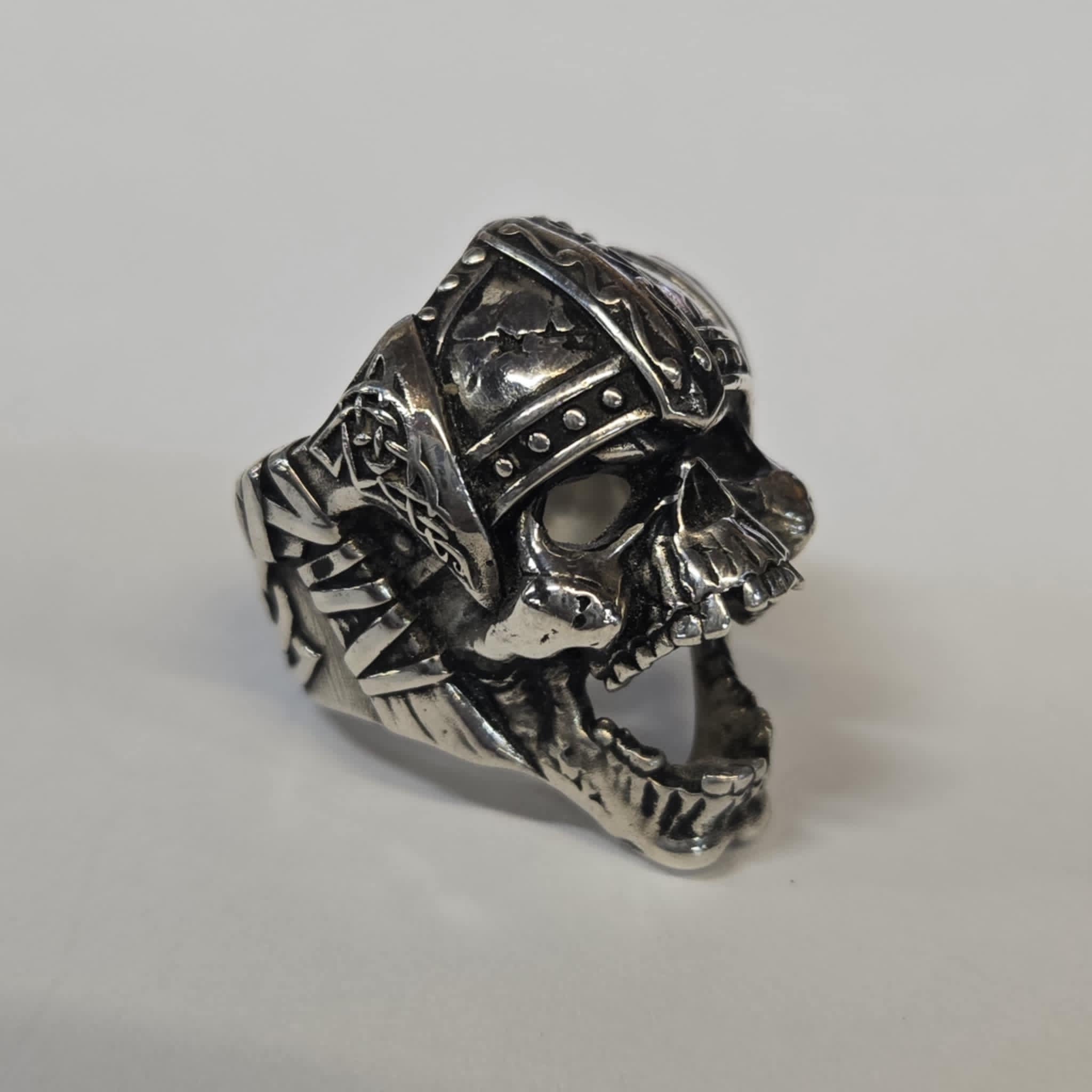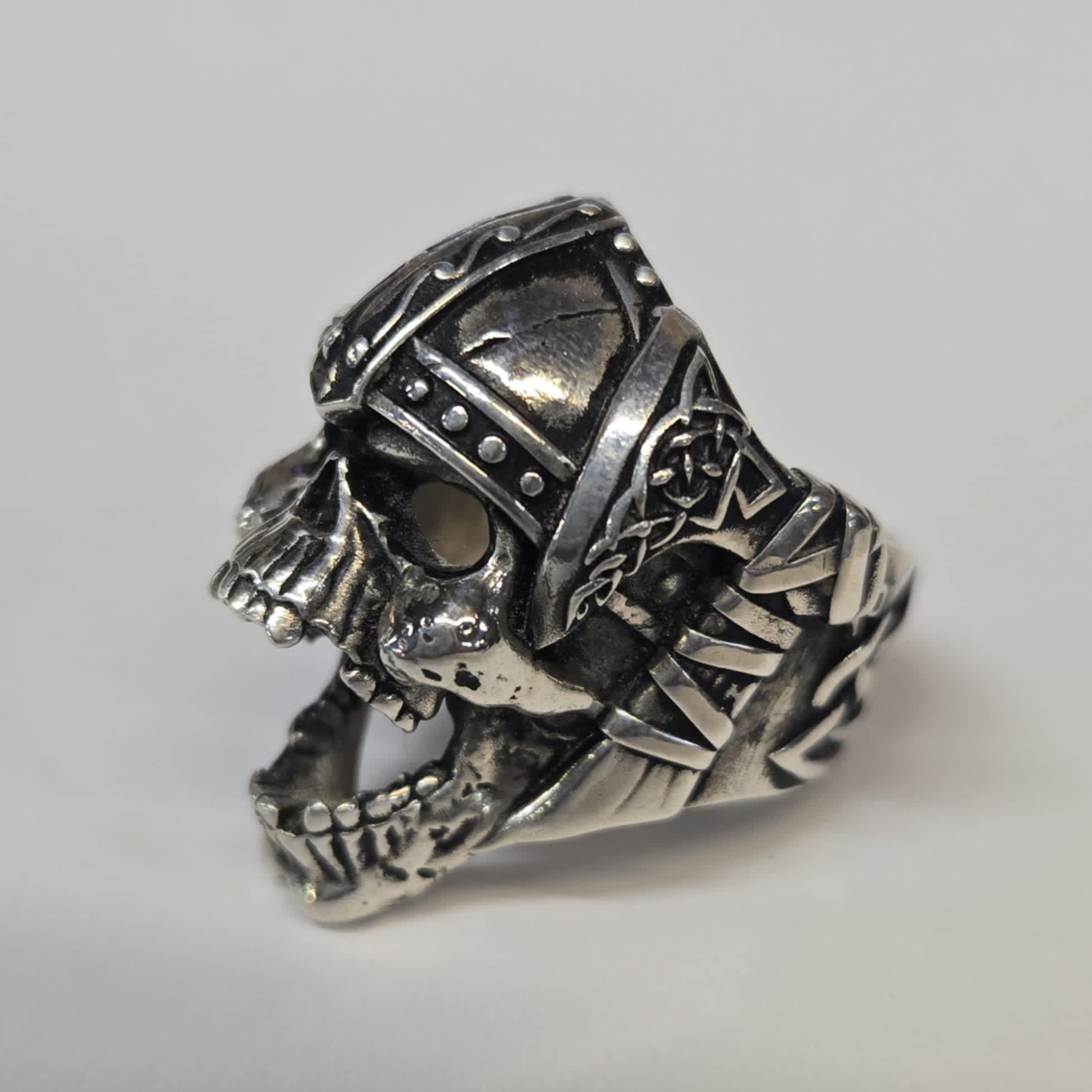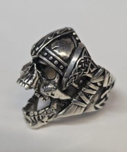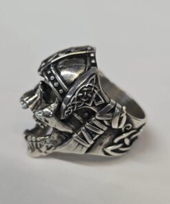 The detail of this ring is next level! This unique design features a snarling skull wearing a Viking helmet. There are hatchets on each side of the ring with rustic Viking designs and the band of the ring has a Celtic design. This ring has a hollow back and weighs 34.72g. It measures 23.50mm wide and 32.8mm tall.