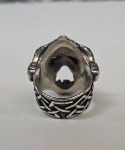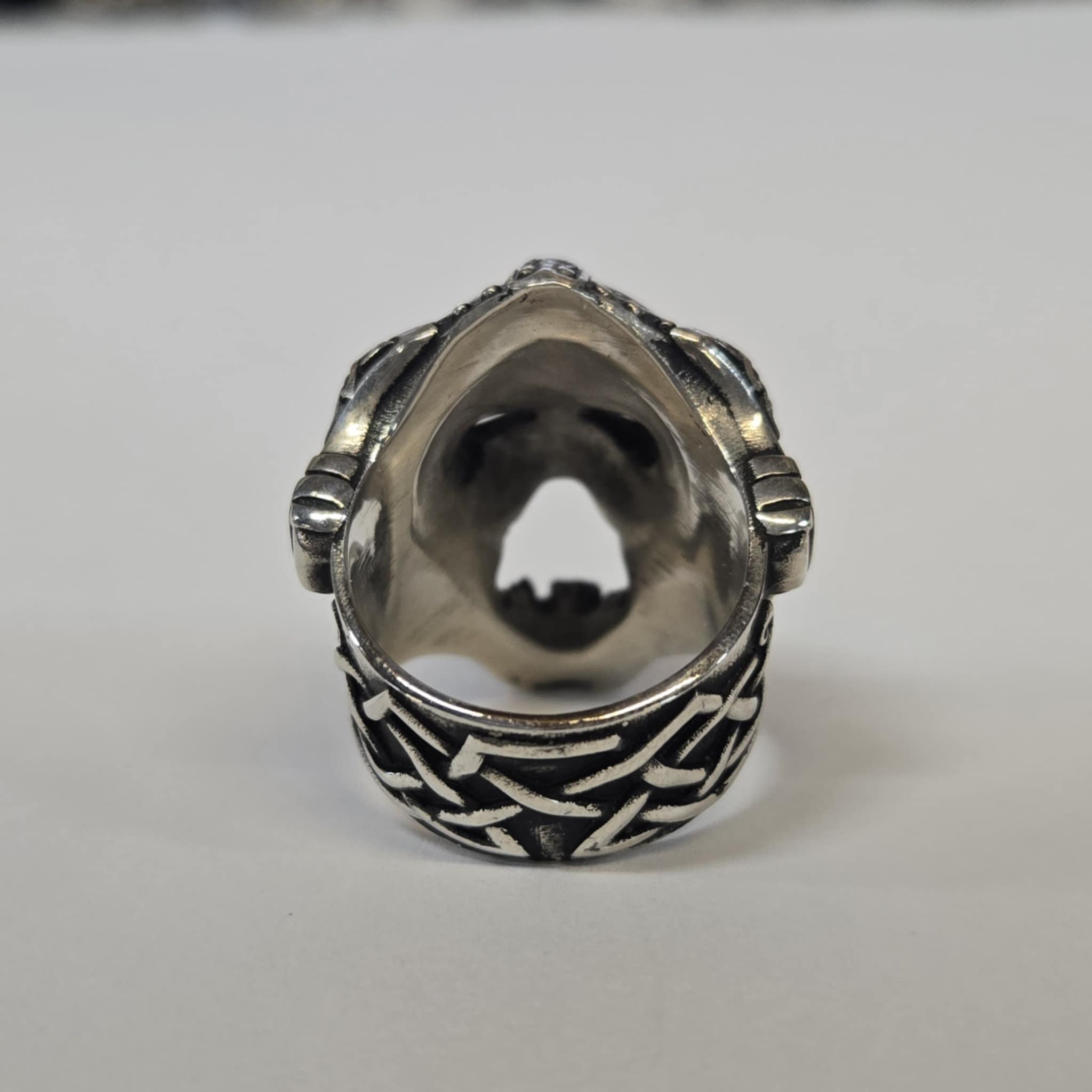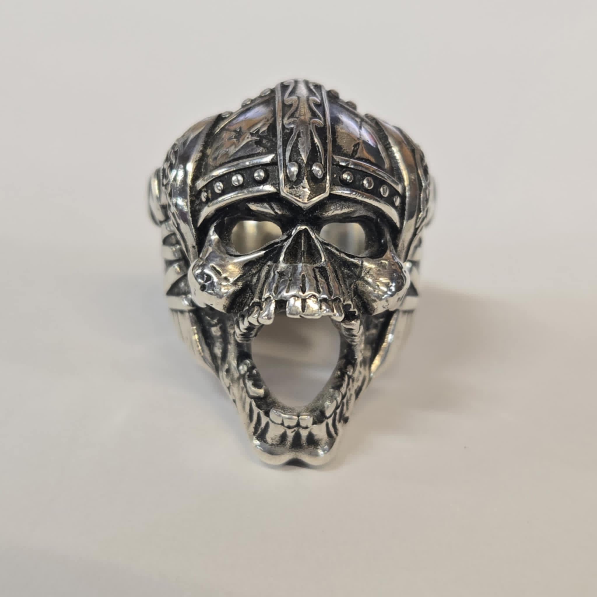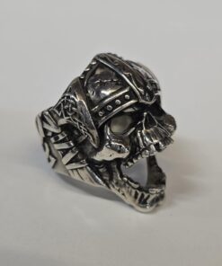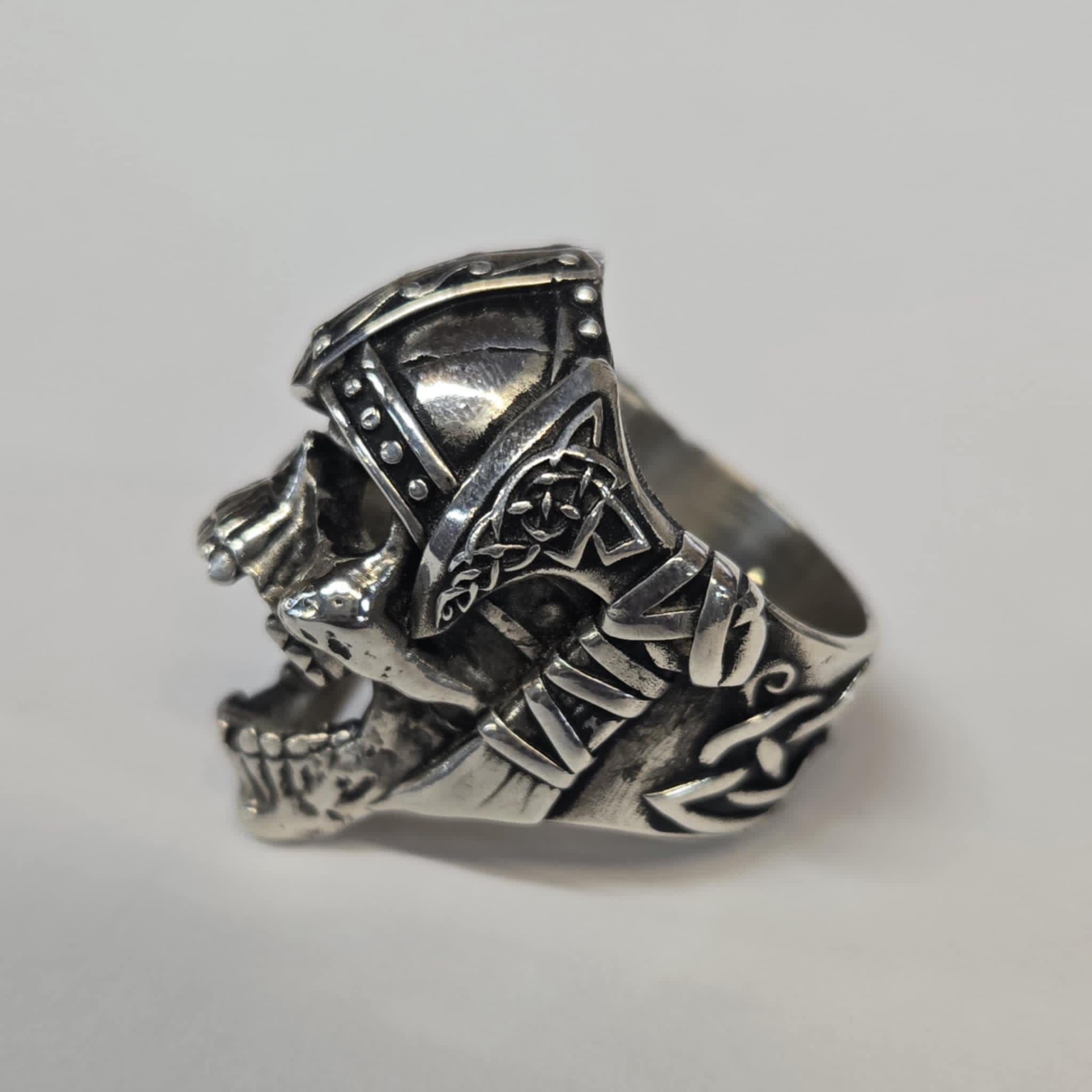 The detail of this ring is next level! This unique design features a snarling skull wearing a Viking helmet. There are hatchets on each side of the ring with rustic Viking designs and the band of the ring has a Celtic design. This ring has a hollow back and weighs 34.72g. It measures 23.50mm wide and 32.8mm tall.