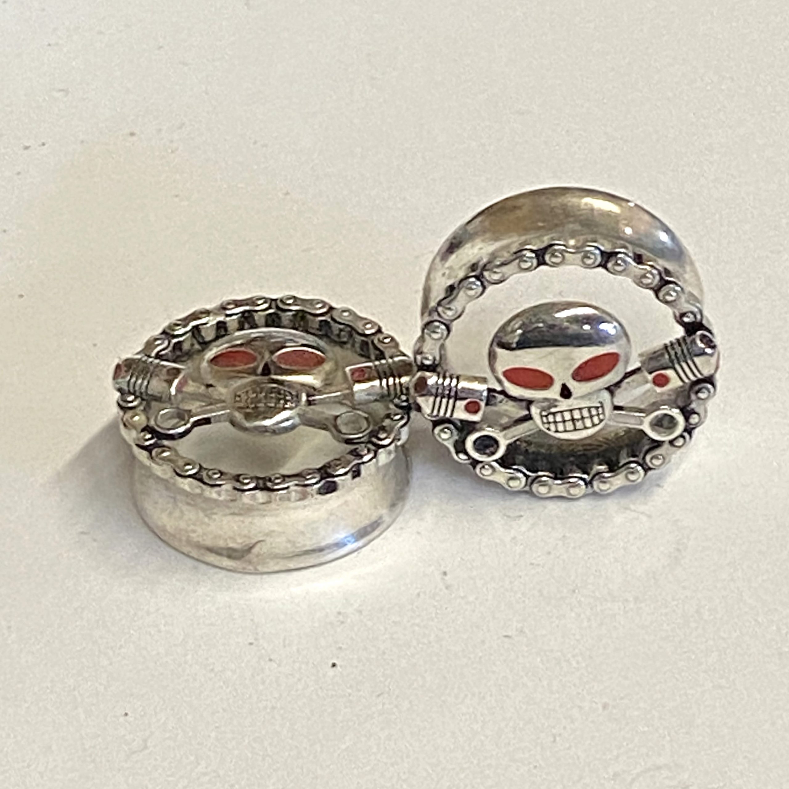 Charlie Ear Tunnel or Plug with Charlie in the center of a circular bike chain.