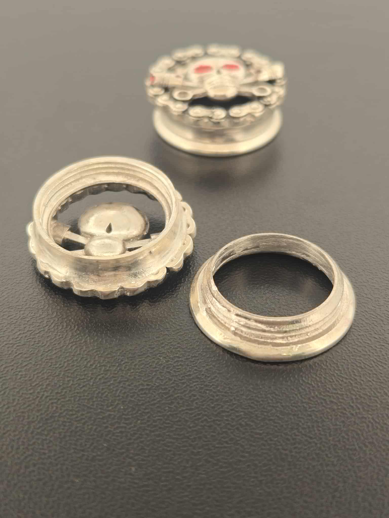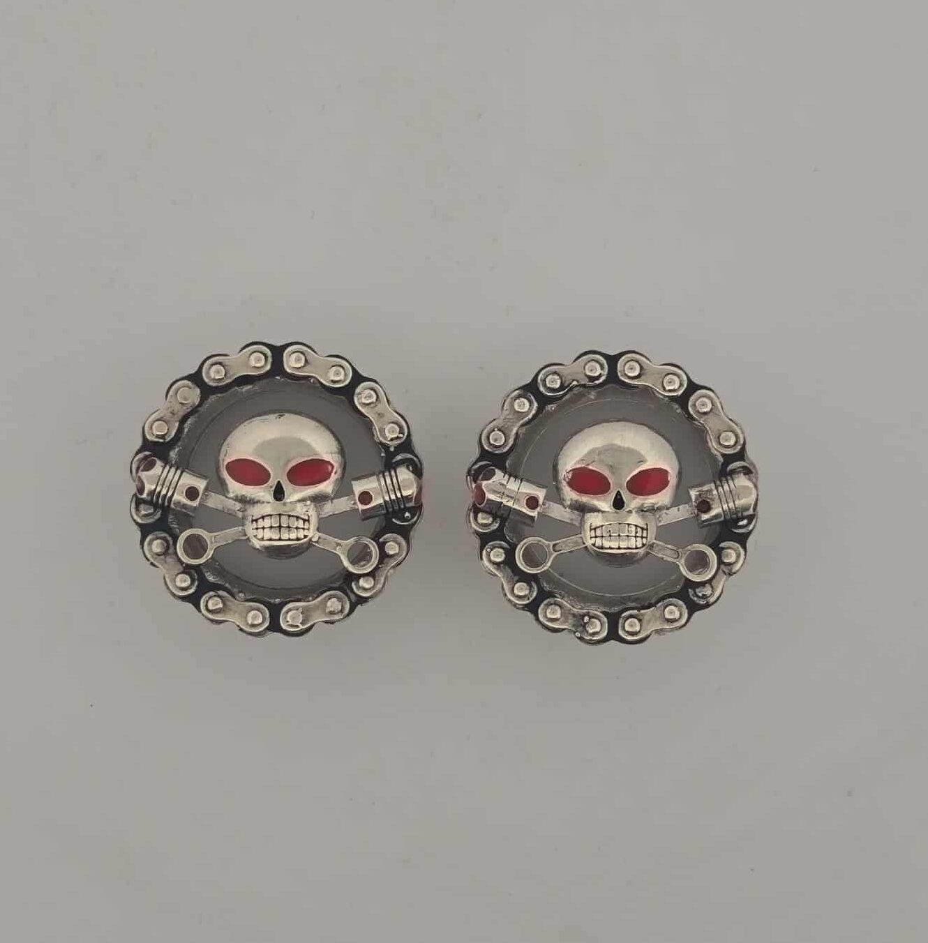 Charlie Ear Tunnel or Plug with threaded backs. Charlie in the center of a circular bike chain.