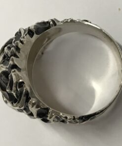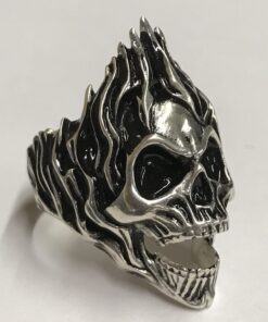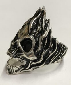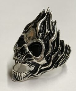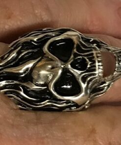 This ring is a skull which is grinning with mouth open wide & flames dance around his head! Very detailed. Really interesting conversation piece!