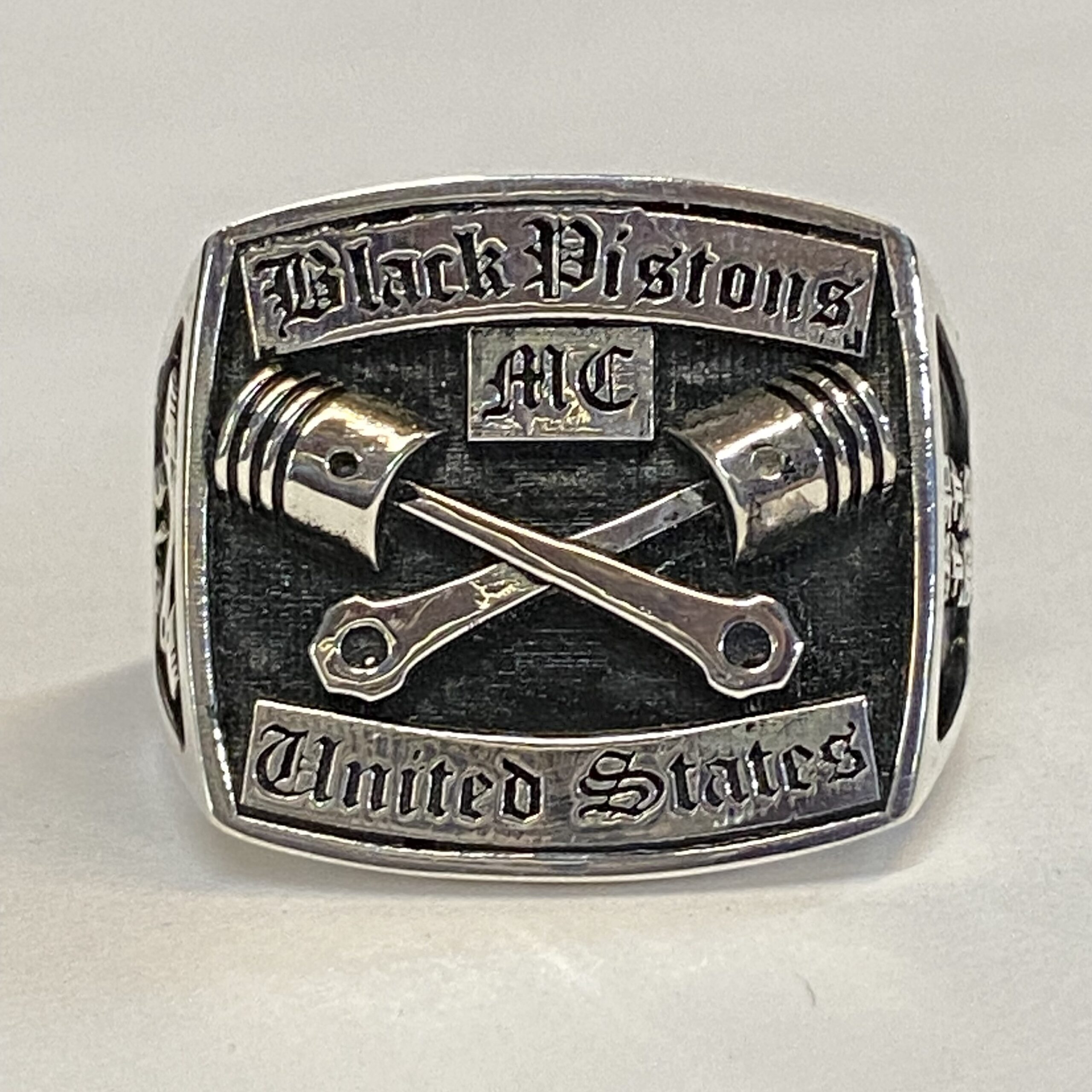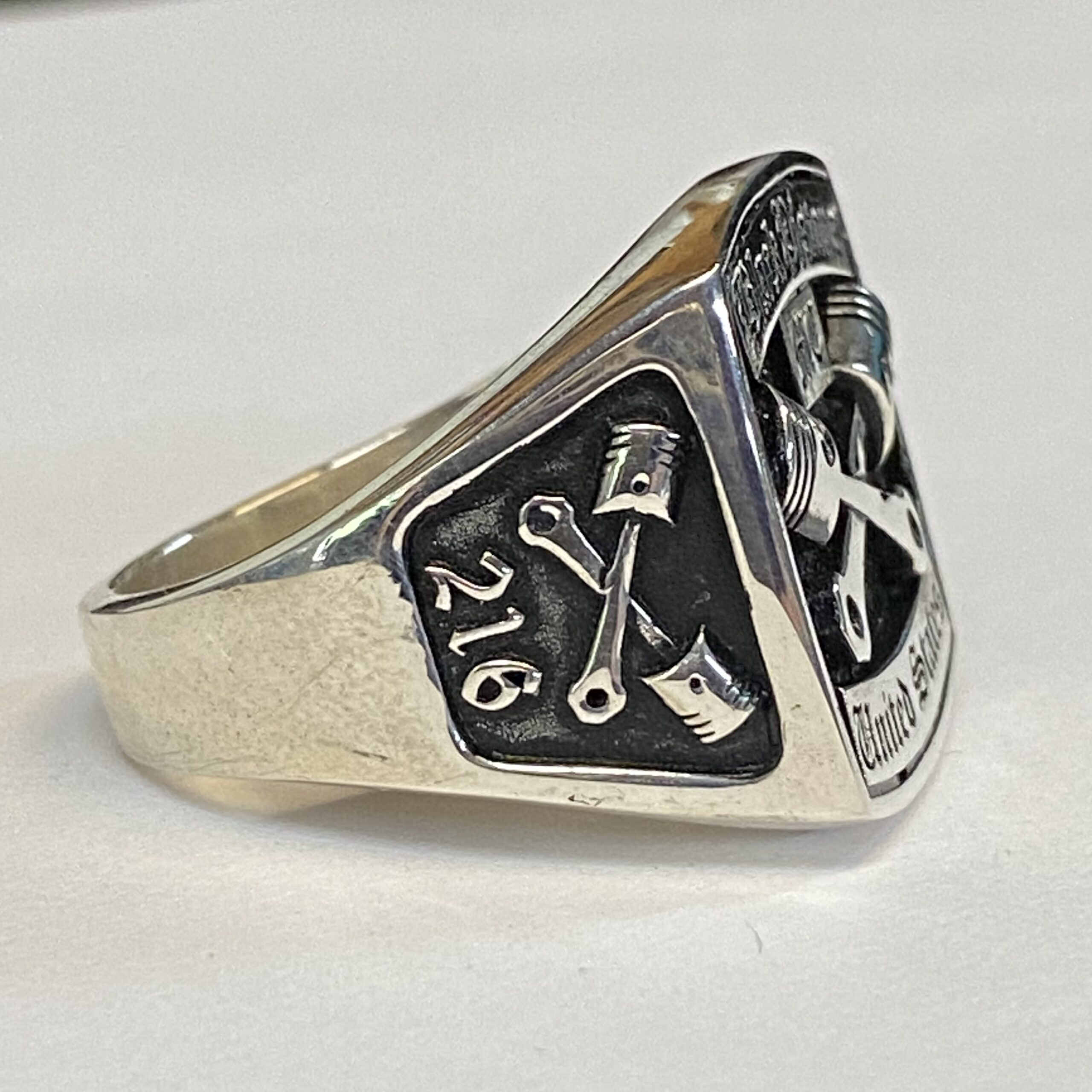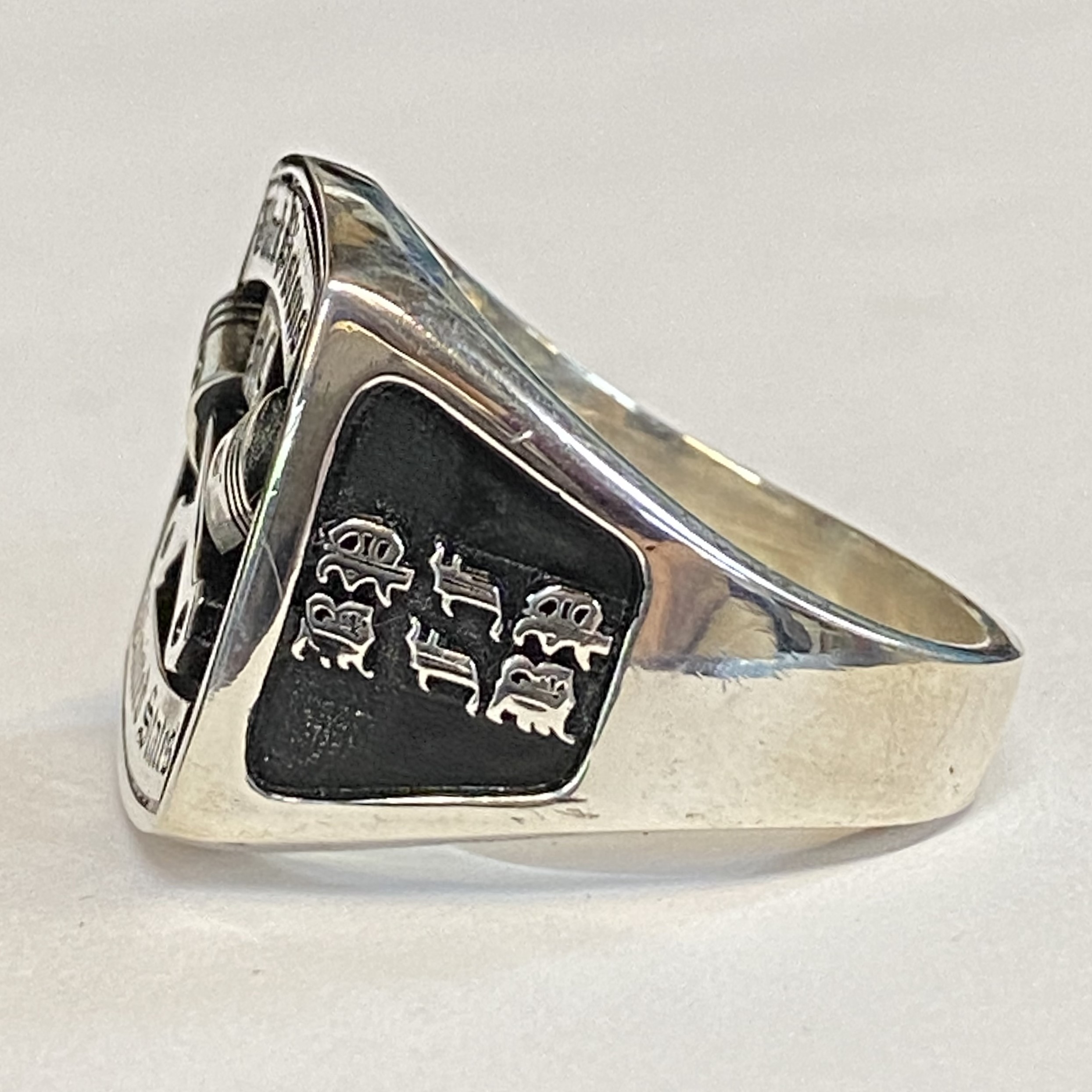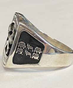 Top is 23.54mm tall x 25.6mm wide and the ring weighs 38.17 grams in sterling silver.