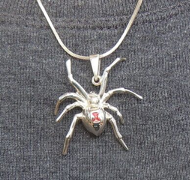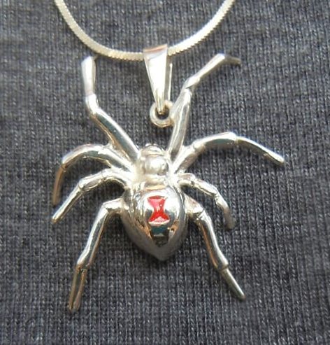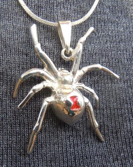 Solid Sterling Silver Black Widow Spider Pendant. Has red enameled hour glass.