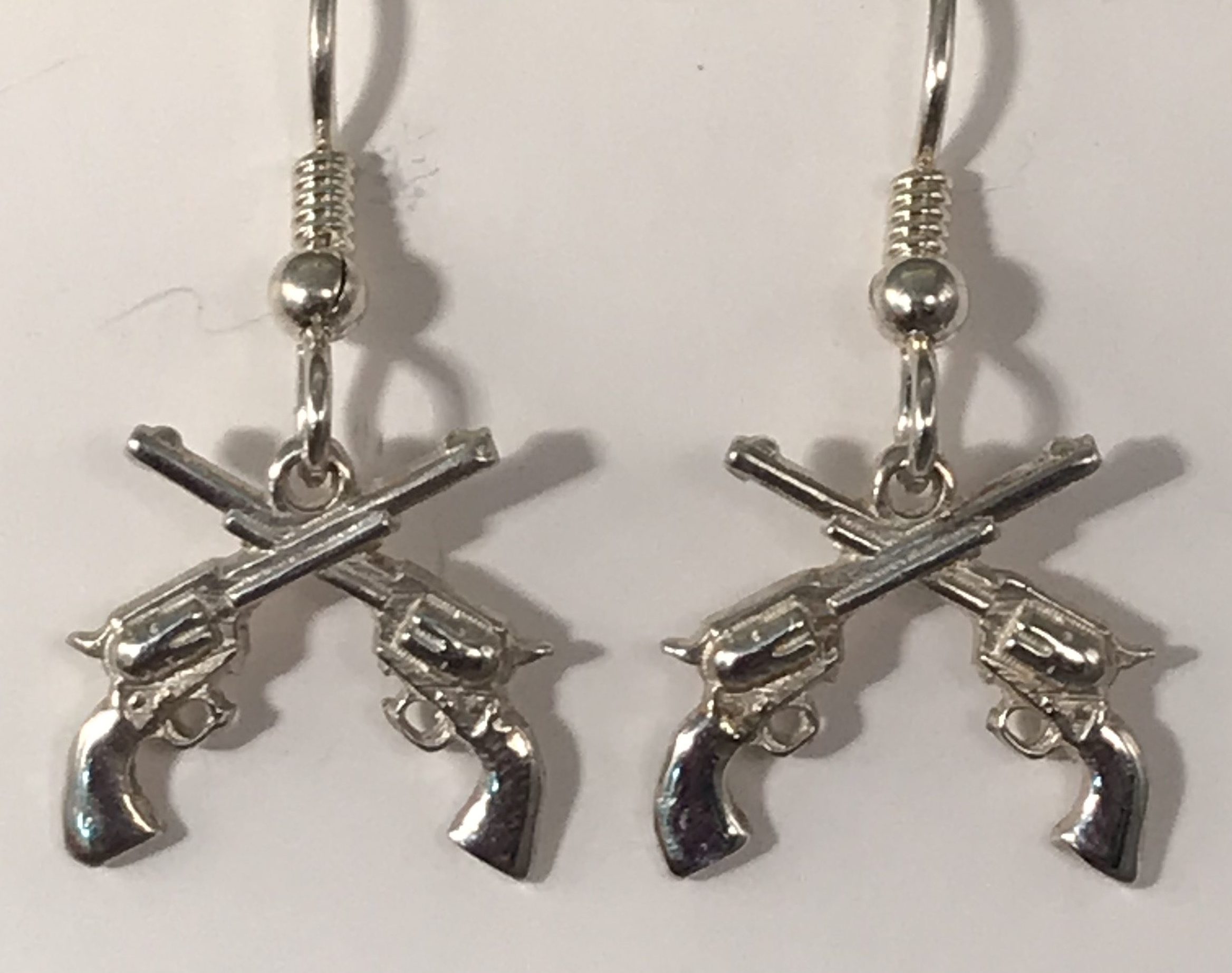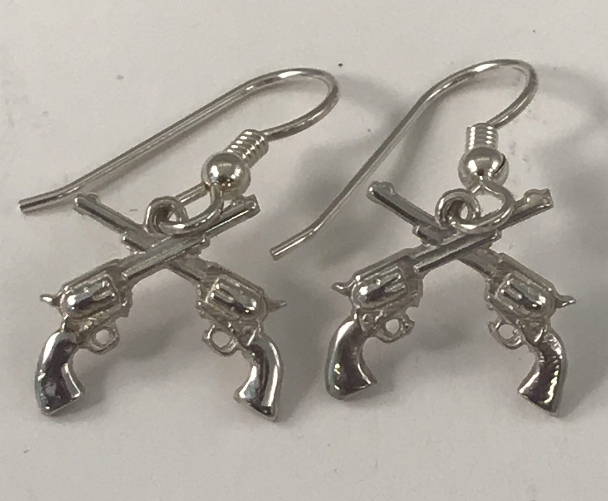 Solid Sterling Silver Crossed Pistol Earrings. The earrings weigh about 27 grams. We also make this item in 10k, 14k or 18k gold and in platinum. Please contact us for pricing on these items.