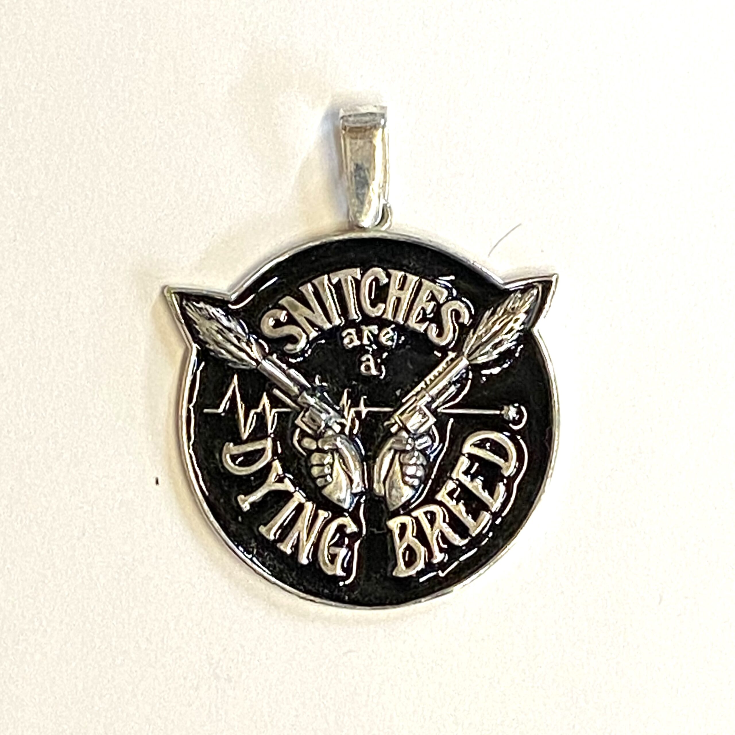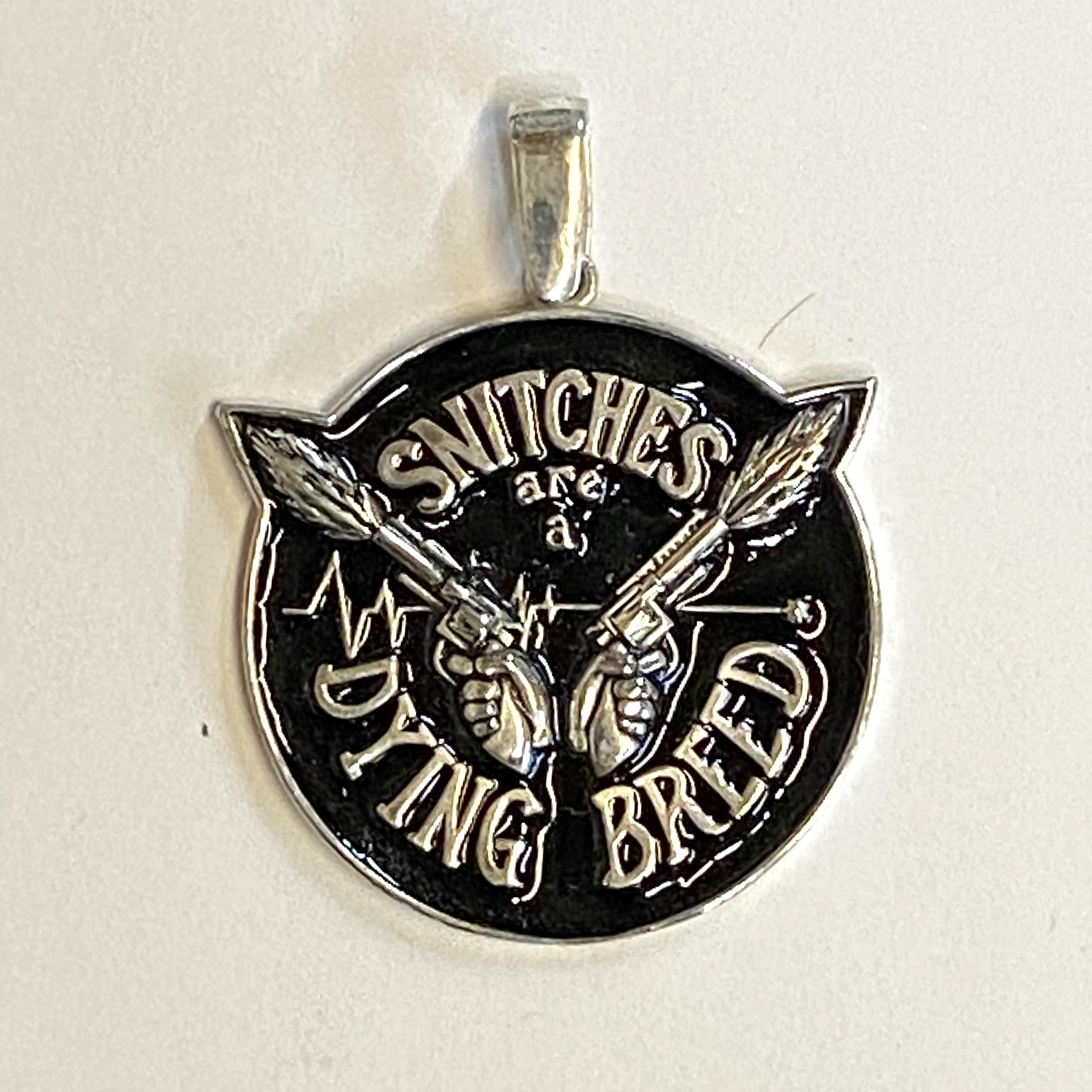 Round Sterling Pendant with Snitches are a Dying Breed and two hands holding blazing guns. Measures 36.5mm in diameter; 52mm tall with bail and weighs 21.31 grams.