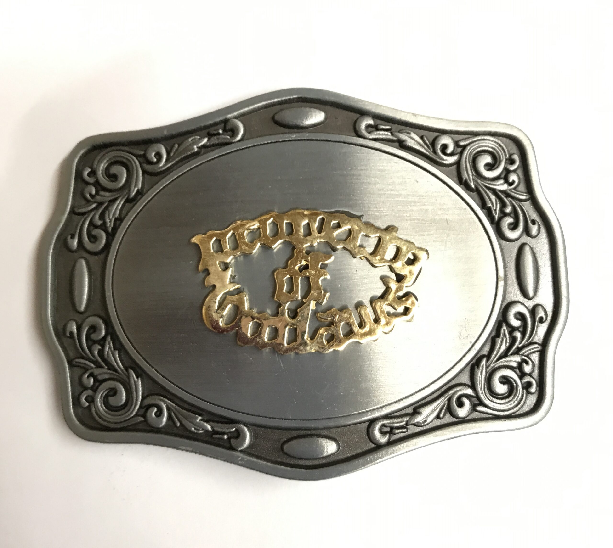 Zinc buckle with a brass medallion saying “Property of Outlaws”